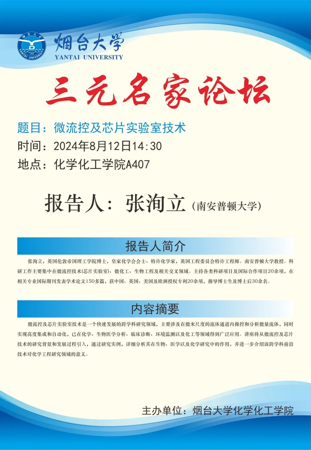 三元名家论坛(绿帽社 )丨《微流控及芯片实验室技术》,主讲:张洵立教授。