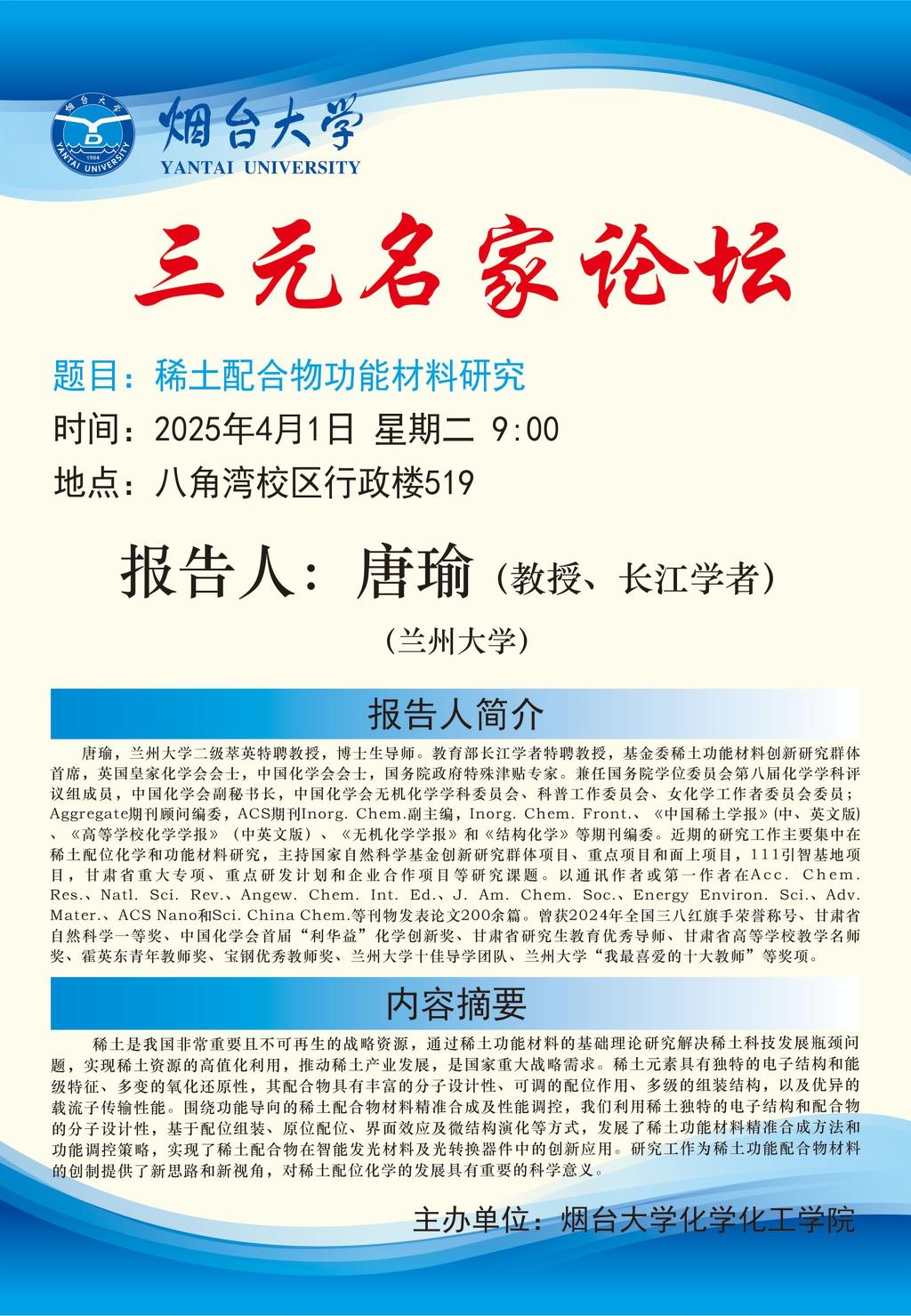 三元名家论坛(绿帽社 )丨《稀土配合物功能材料研究》,主讲:唐瑜教授