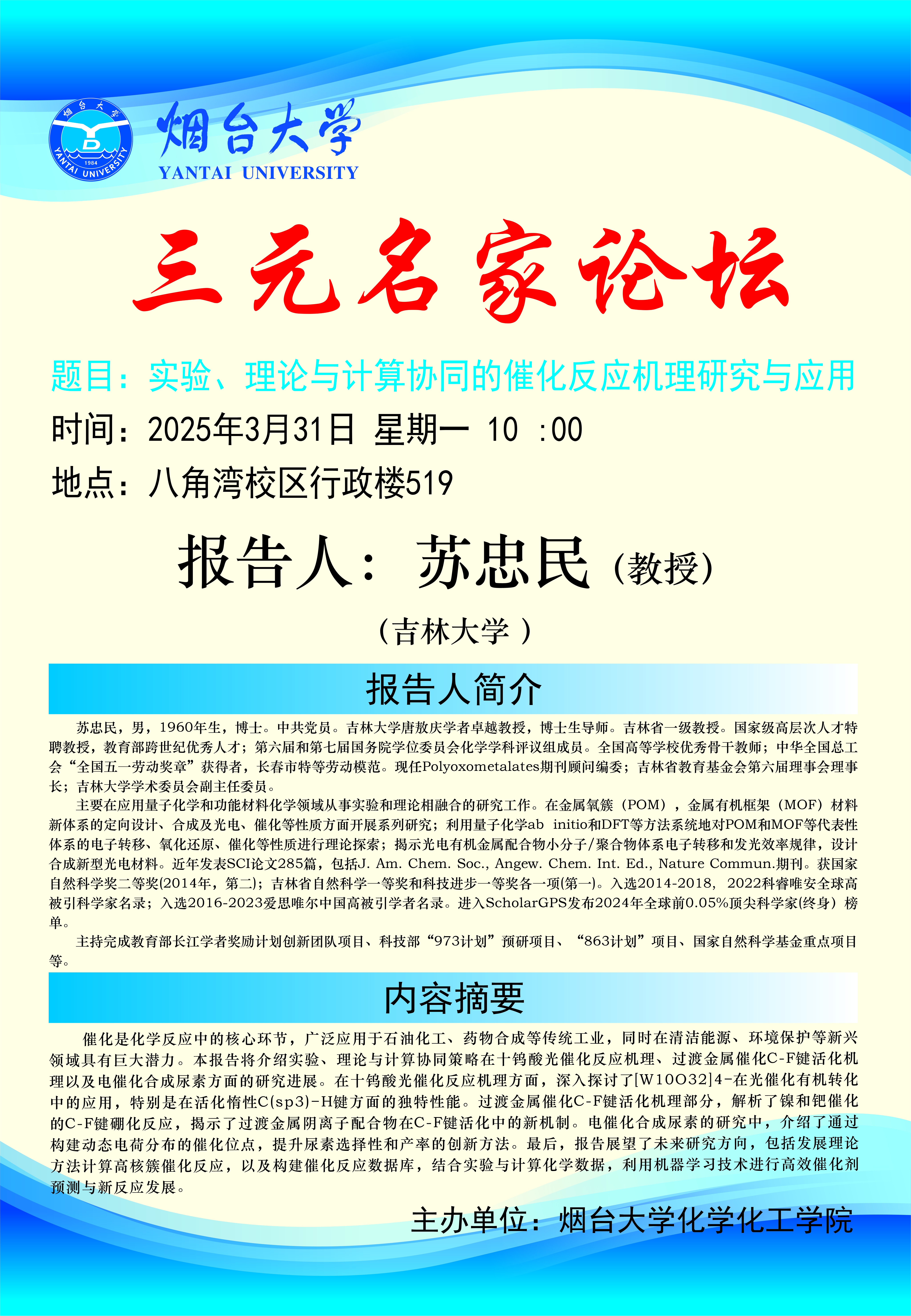 三元名家论坛(绿帽社 )丨《实验、理论与计算协同的催化反应机理研究与应用》,主讲:苏忠民教授