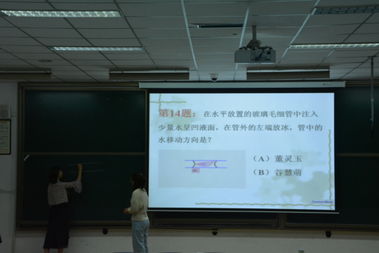 在比赛开始前,金明善老师邀请化153的郭志浩同学为17级同学加油。比赛现场,同学们满含热情,认真答题,认真思考,在金明善老师的带领下,参赛选手发挥自身真实水平,比赛题目更是接近生活,如“用清水洗完脸后,觉得脸有些绷紧,这说明人脸的表面张力比水的表面张力大或者小”。更是有轻松欢快的复活赛,优秀考研代表的考研分享,多种多样的出题模式,金老师秉承着给予学生更多锻炼机会,挑战自身的原则,让参赛同学有更多机会参与挑战赛,体验物理化学学科的乐趣与社会意义。