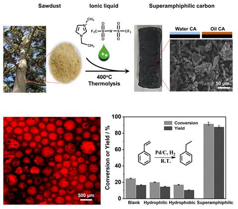 化学所的研究人员意外发现,在廉价的锯末中加入少量疏水离子液体,即可通过简单的一步碳化实现超双亲碳材料的宏量制备。以这种超双亲碳作为载体,可以极大降低液—液两相反应体系的传质阻力,进而增强Pickering乳液催化的反应效率,产物收率提高3倍以上。研究成果以“Hydrophobic Ionic Liquid Tuning Hydrophobic Carbon to Superamphiphilicity for Reducing Diffusion Resistance in Liquid-Liquid Catalysis Systems”为题被国际权威化学期刊Chem(Cell的姊妹刊,IF = 19.7)接受(DOI:10.1016/j.chempr.2021.03.014)。绿帽社