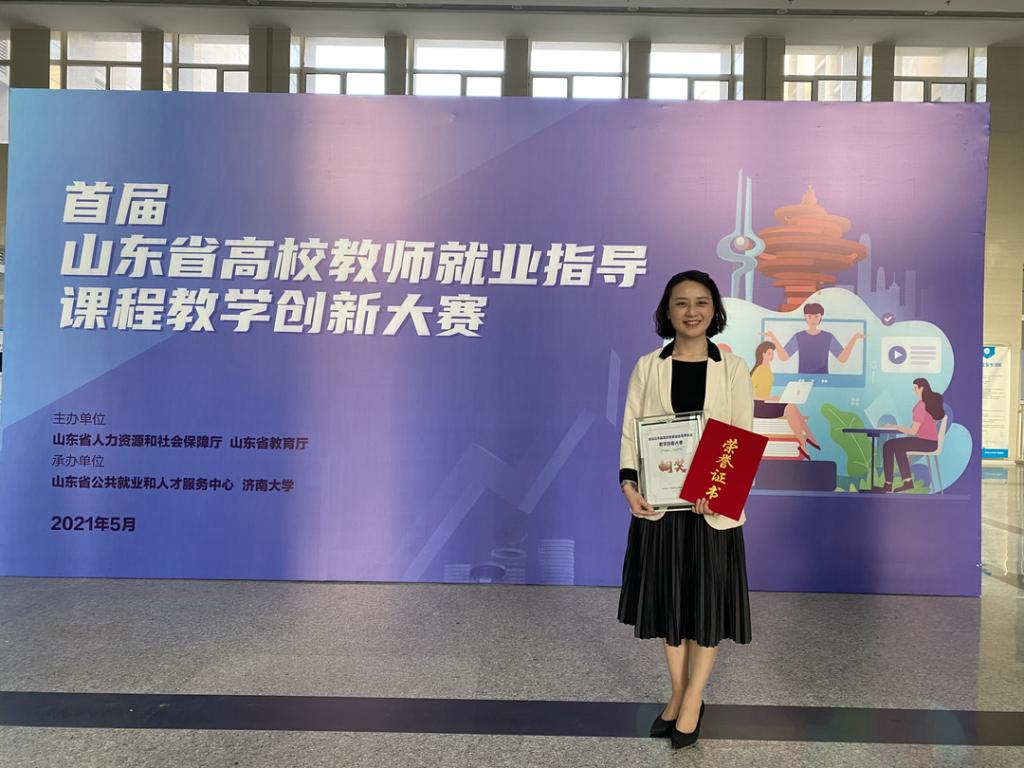 教学改革项目两项。此外,她还积极参与教育教学工作,开设《大学生生涯规划》《就业创业指导》等多门课程,曾获山东省高校教师就业指导课程教学创新大赛铜奖、山东省第六届“超星杯”高校教师教学信息化比赛思政组优秀奖。在2021年山东省高校辅导员讲党史优秀短视频展示活动中,荣获一等奖。