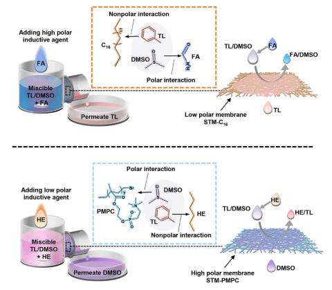 互溶有机液体小分子(特别是分子量小于100的有机分子)的高效分离和纯化,被认为是能改变世界的一类化学分离过程,对石油精炼、精细化工以及药物研发至关重要。受水处理分离膜的启发,有机溶剂反渗透膜、有机溶剂正渗透膜和有机溶剂渗透蒸发膜已经成功实现了互溶有机液体小分子的分离。但这几种分离膜存在分离通量低、易污染等缺点。仿生超浸润分离膜可实现不互溶有机液体小分子的高效、高通量分离,但对互溶有机液体小分子体系束手无策。针对这一难题,绿帽社