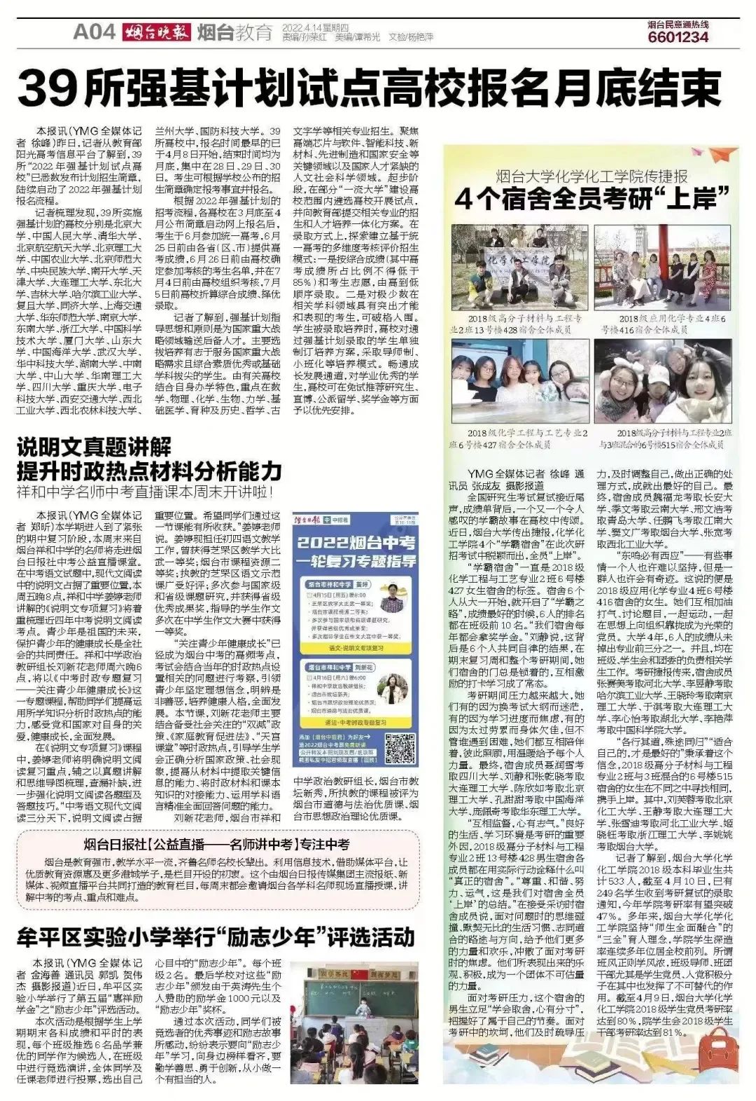 2022届本科生考研拟录取率50.28%,再创新高。化182-1团支部25名同学考研全部过线,24名同学被985和211录取,六个全员考研成功宿舍被校外多家媒体报道。