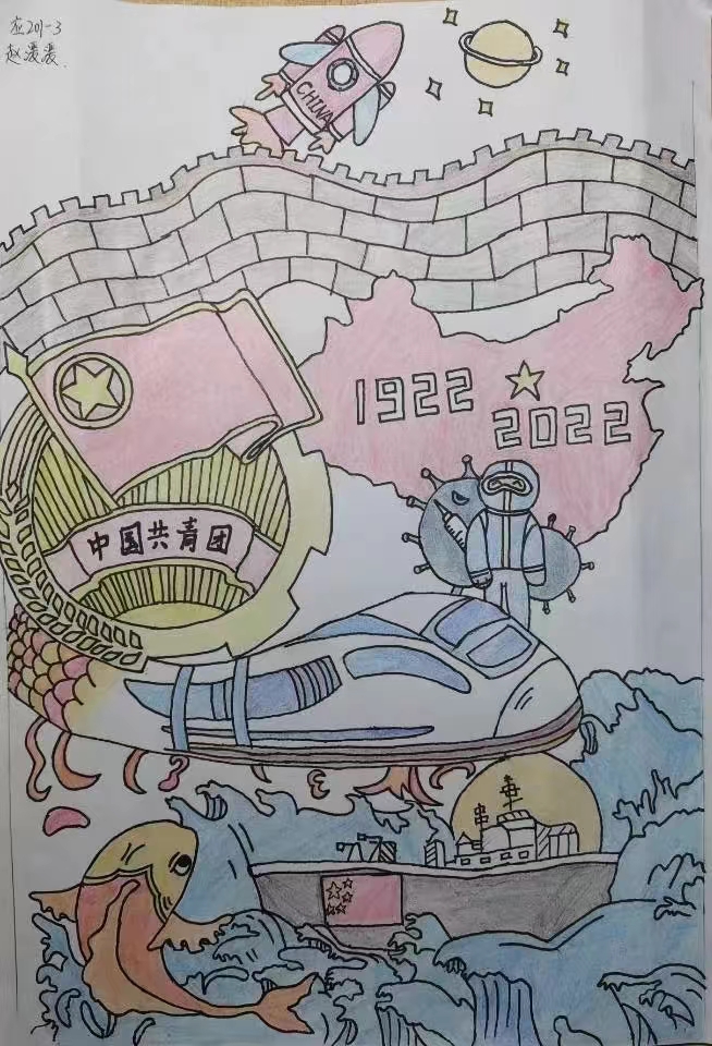 作品以建团百年为主题,其中作品中的“火箭”一是为了宣传航天精神,二是体现我国在航天方面的成就;“高铁”元素是希望我国的发展能像高铁一样突飞猛进;“巨浪中的轮船”是为了展现出我国在百年来的大风大浪中依然砥砺前;近两年来新冠疫情反复,而“医疗工作者”毅然站在前面为筑起堡垒;“锦鲤”寓意着吉祥与好运,希望我国在往后的日子里繁荣昌盛;“团徽”起到重要意义,弘扬共青团精神,青年更要肩负时代使命,做乘风破浪的开拓者。