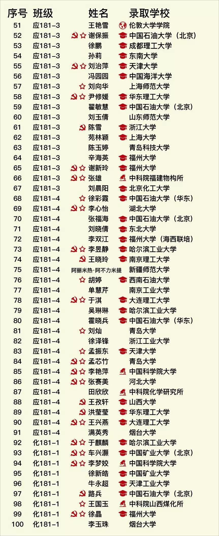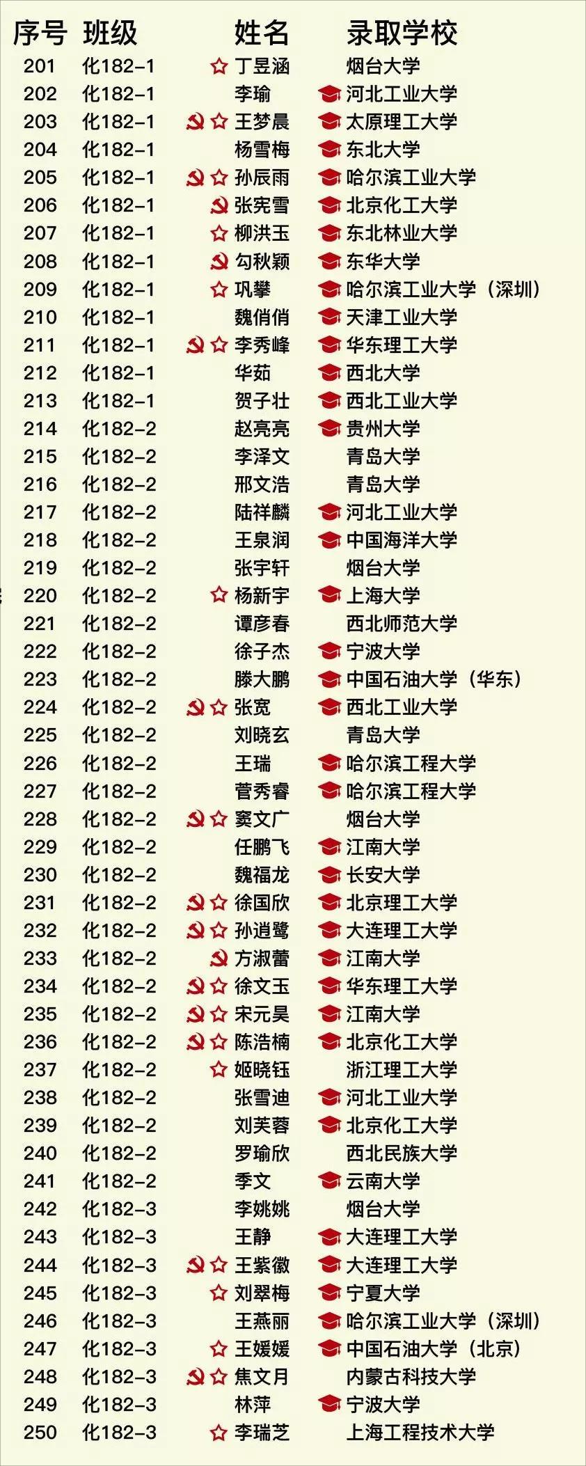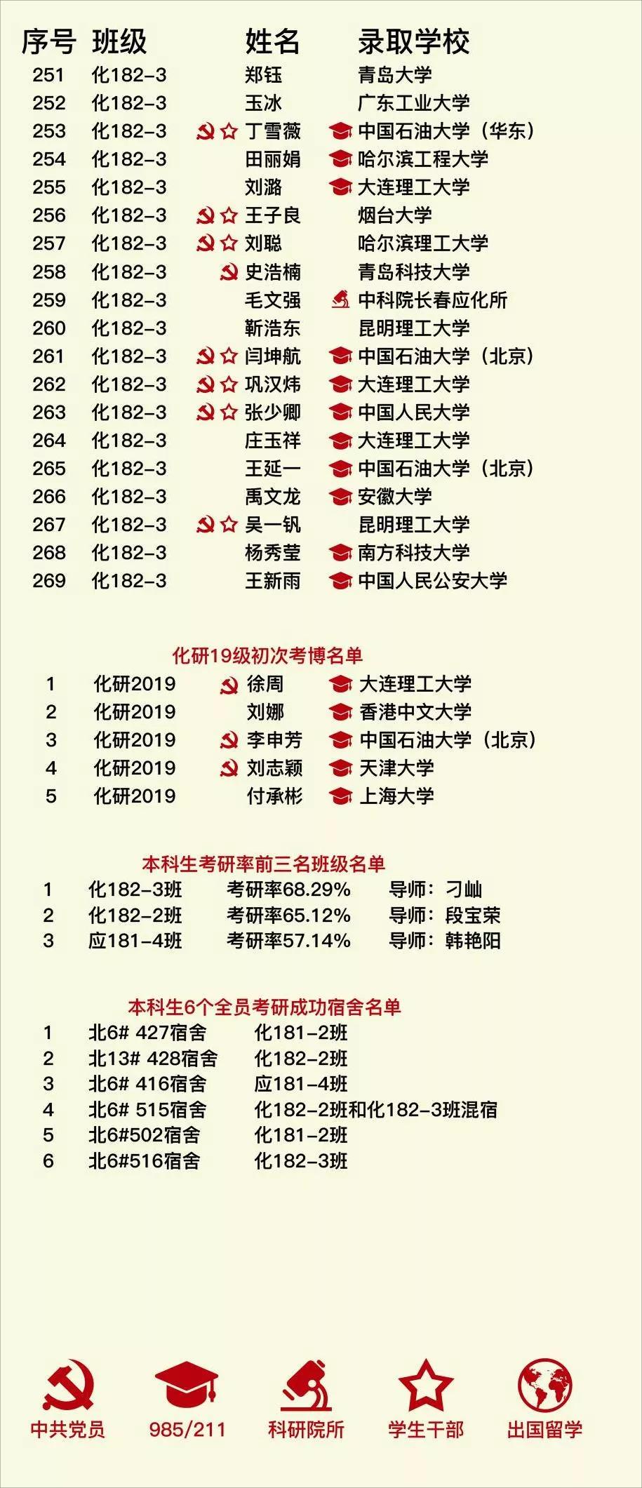 考研(博)率稳步提升。2017年至今,本科毕业生初次考研率从最开始的30%多,稳步提升到突破50%。今年,2018级本科生共有269名学生成功考取硕士研究生,化182-1团支部25名同学考研全部过线,其中24名同学被985和211录取;全院六个宿舍全体考研成功,被多家媒体报道;2019级研究生中有5名同学考取博士研究生,实现历史最高。