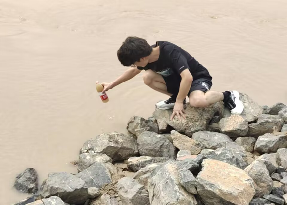 实践队成员应211-1朱雍赫在济南市槐荫区黄河河口处取水样。