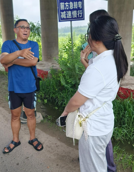 实践队成员应221-2李冉、应211-1赵胜楠同济南市槐荫区黄河河务局附近居民交谈。