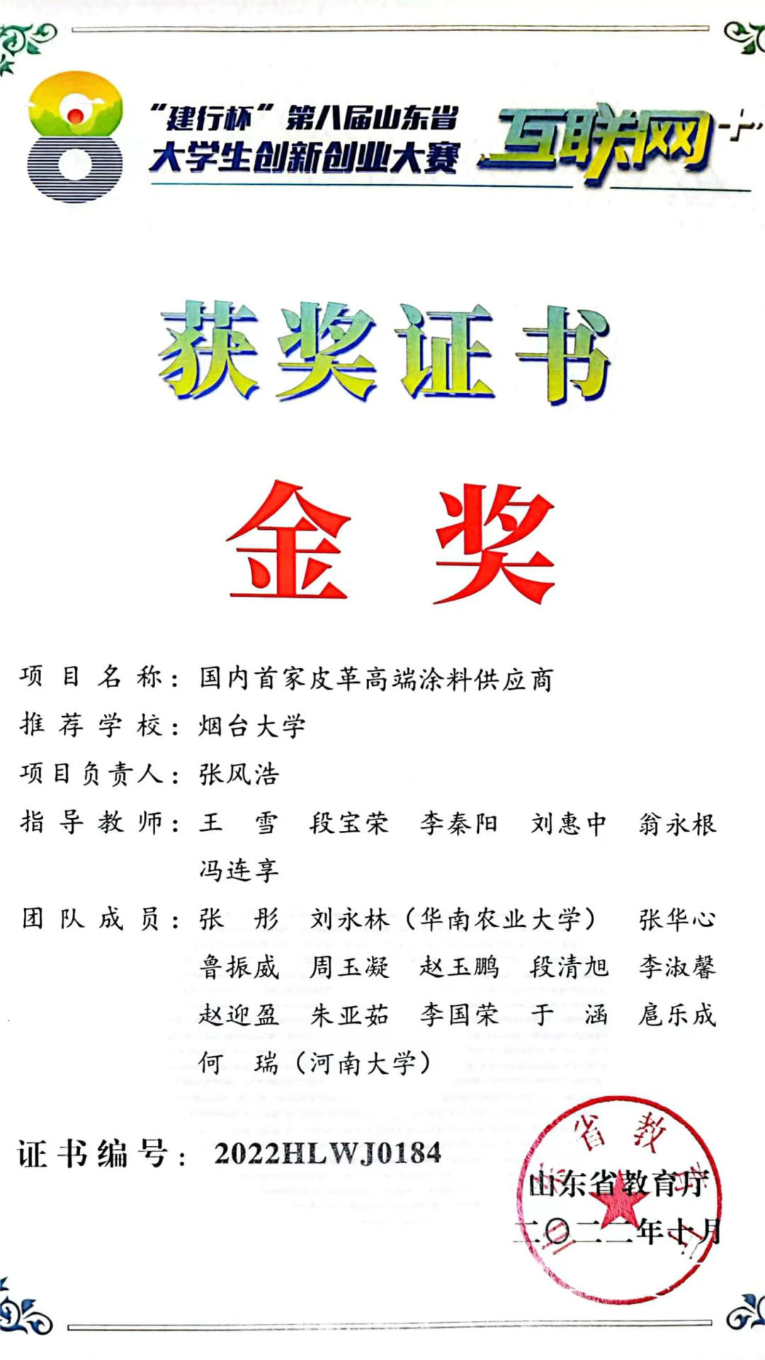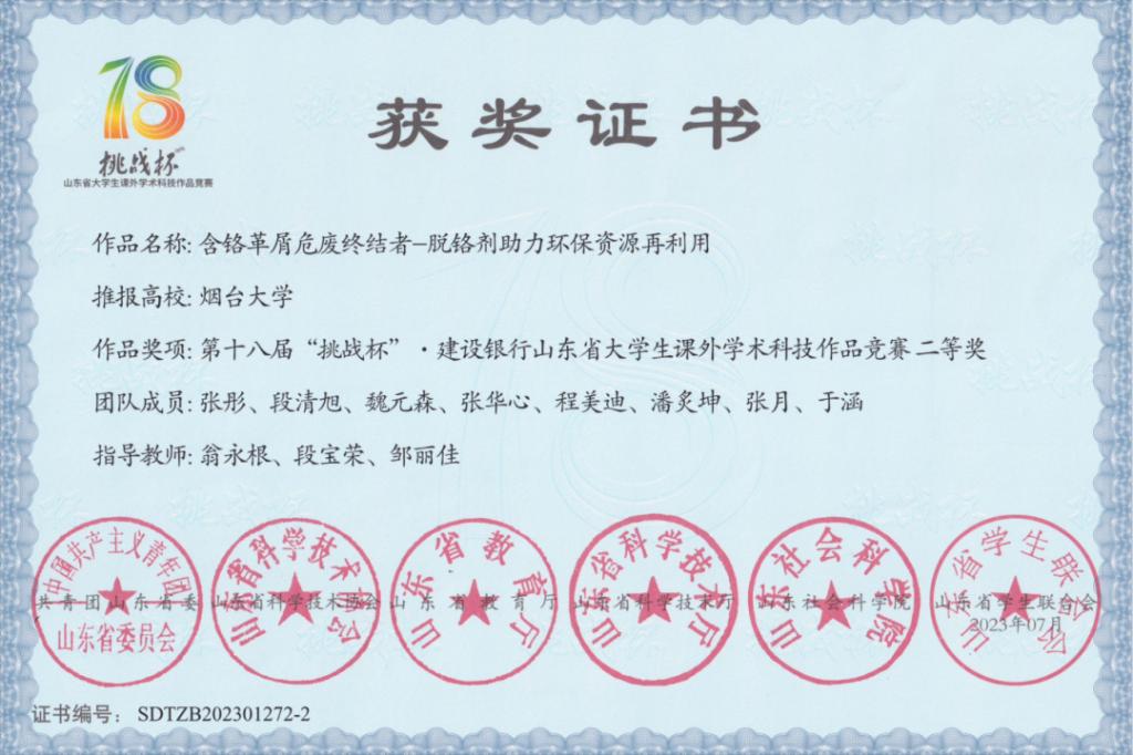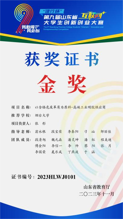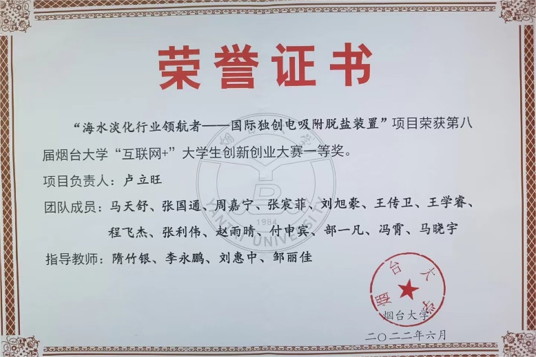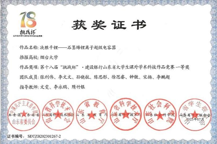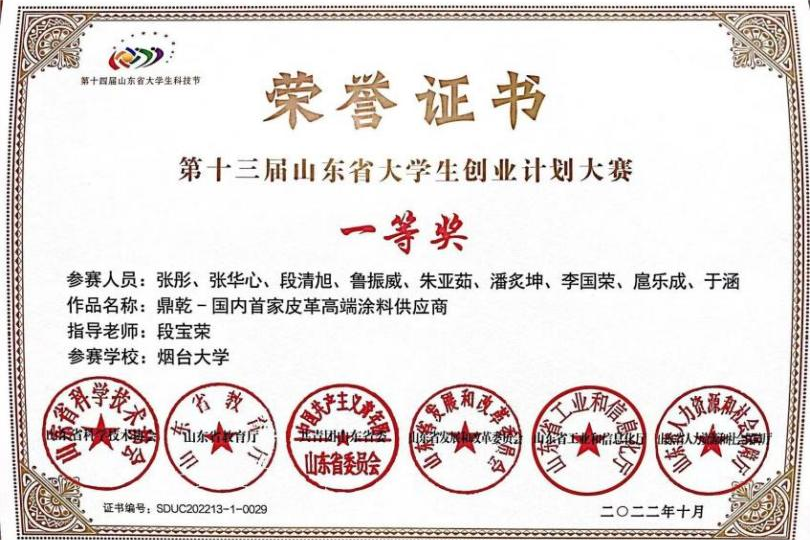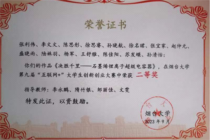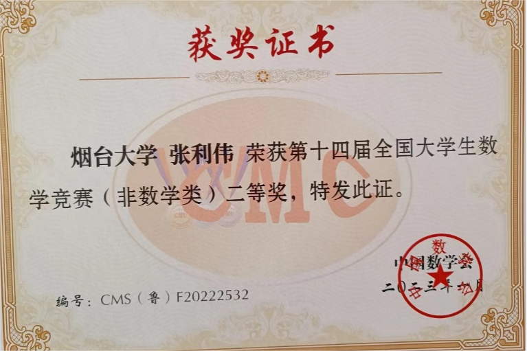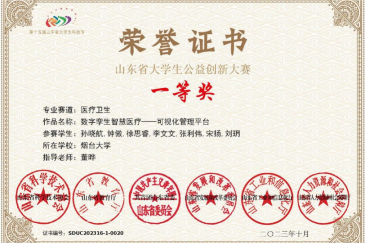 大学生创新创业大赛一等奖、“建行杯”“互联网+”第八届山东省大学生创新创业大赛铜奖、全国大学生数学建模竞赛获得山东赛区二等奖、第十三届山东省大学生数学竞赛(非数学类)二等奖、第十八届“挑战杯”山东省大学生课外学术科技竞赛一等奖等。