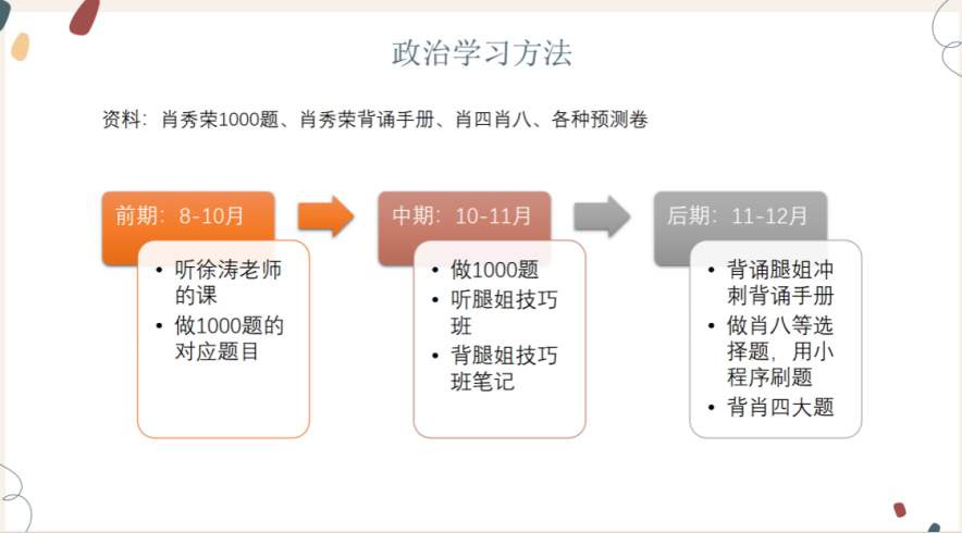 关于政治的学习,吕文娜前期听的徐涛老师的网课并做了《肖秀荣1000题》;中期主要靠“腿姐”,听她的技巧班并反复背诵笔记;后期综合各类资料进行冲刺,比如《腿姐冲刺背诵手册》、“肖四肖八”。