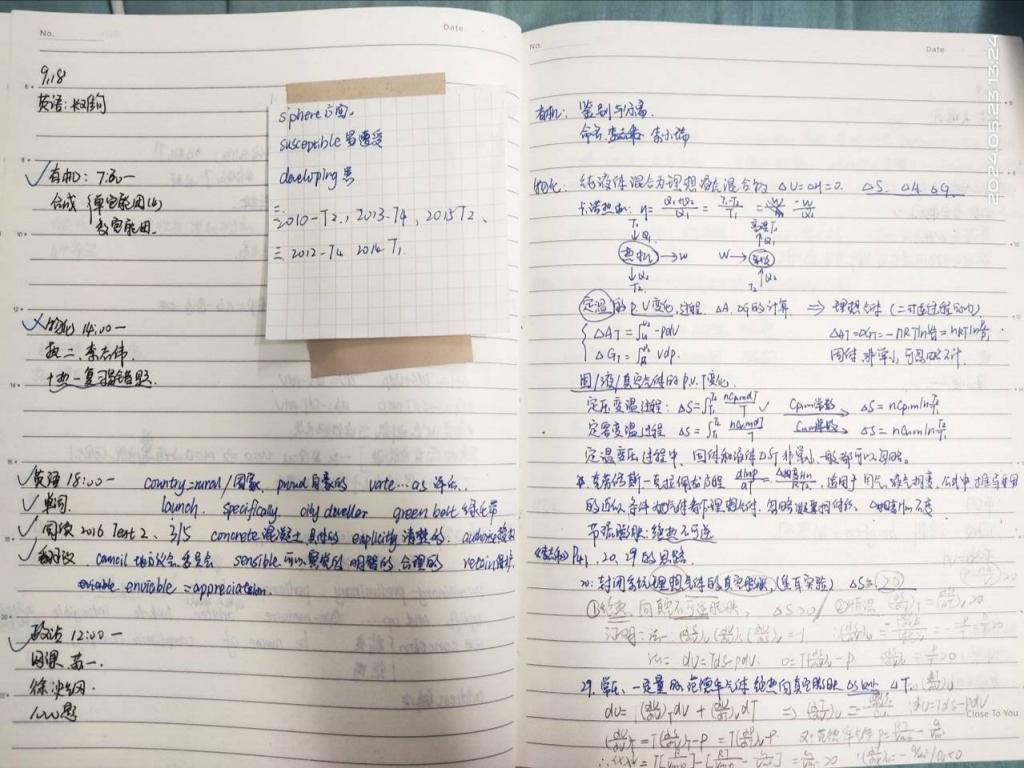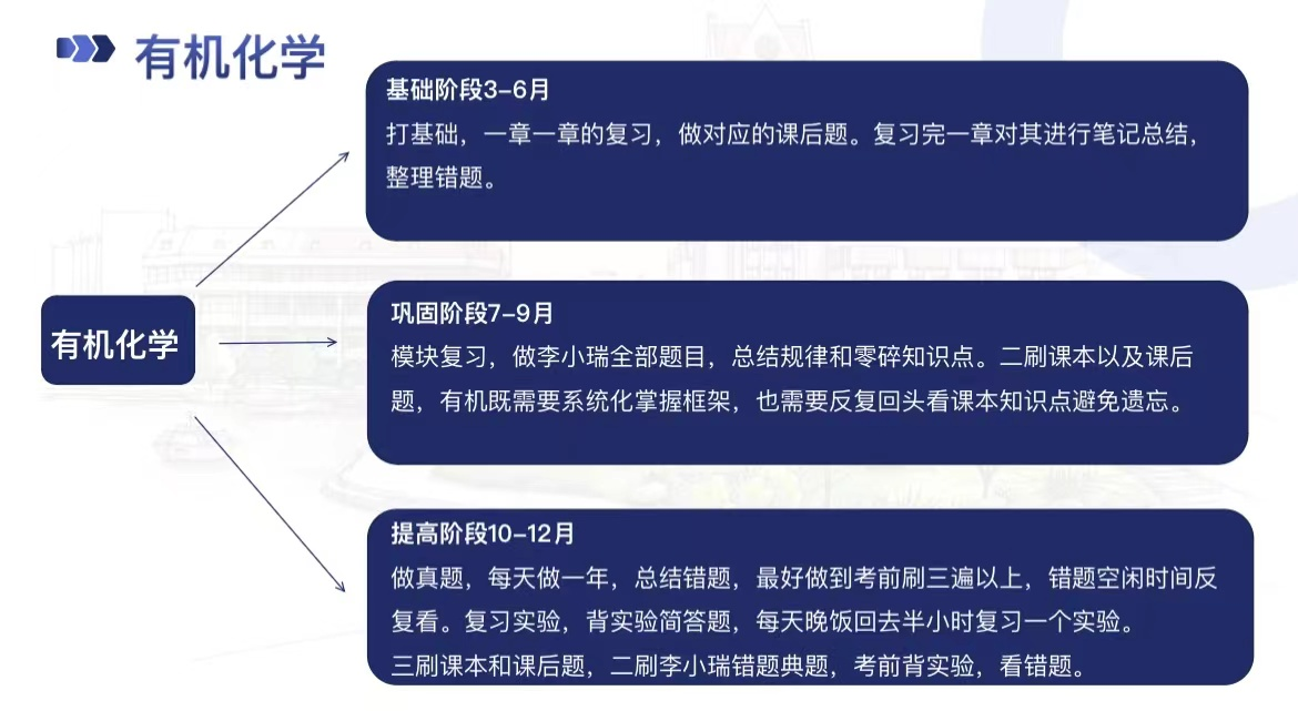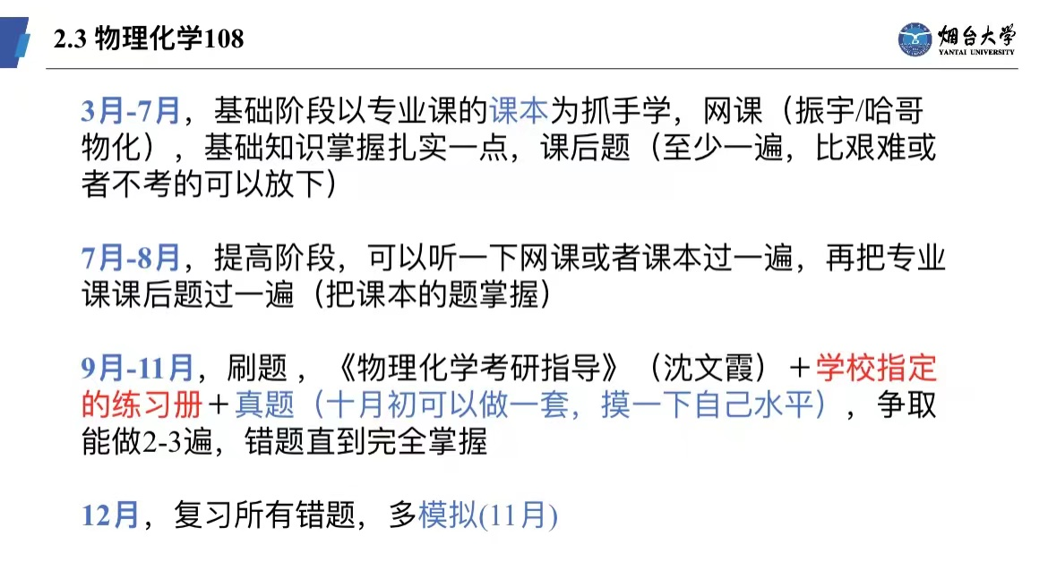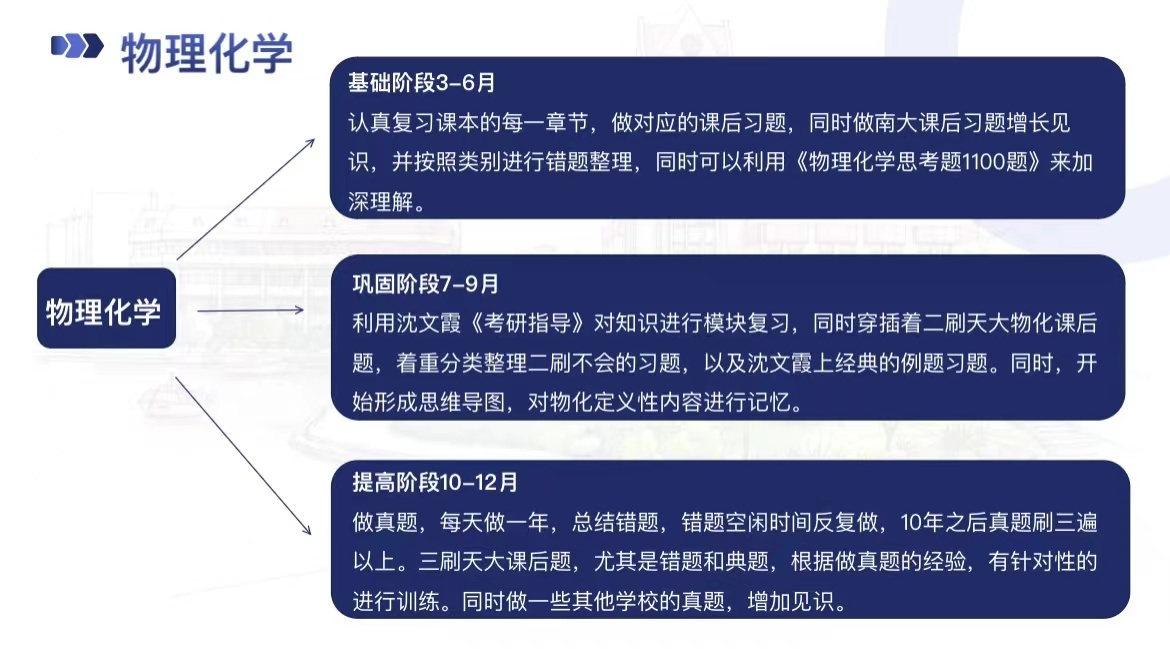 在物理化学科目的复习上,牛和旭给出了以下几点建议:极为关键的一点是要认真细致地画“思维导图”,不能只画个大概,因为只有这样,才能清晰地明白这一部分所讲的内容。牛和旭还提到公式记忆一定要准确,可以先自己推导一遍公式,这样更有利于记忆。此外,一定要及时且详细地整理错题,并做好分类整理。