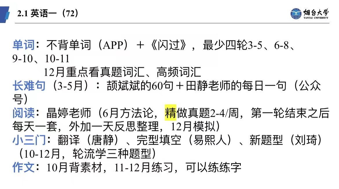 她深知数学的重要性,于是早早便开始准备。她选择的是武忠祥老师的网课,通过系统、全面的学习来夯实基础;此外,刷题是提升数学能力的关键,她建议一个模块一个模块开始练习,最后再做综合题。而整理错题则是最重要的环节,一定要确保自己真正掌握了每一个知识点。