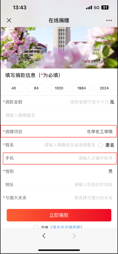 五、填写完成以后,选择“同意《基金会法律声明》”,点击“立即捐款”,便可成功完成线上捐款。