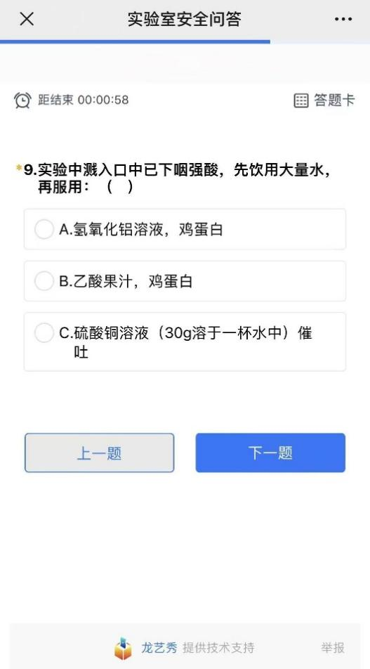 举办“实验室安全知识竞答活动”,本次活动通过线上小程序开展。旨在确保学生了解实验室安全的重要性和必要性,提高同学们对实验室安全问题的关注度;培养同学们主动遵守实验室安全规定的意识,并形成良好的安全习惯。