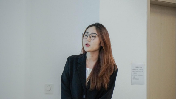 应221-3班班长孙清怡正在答辩。