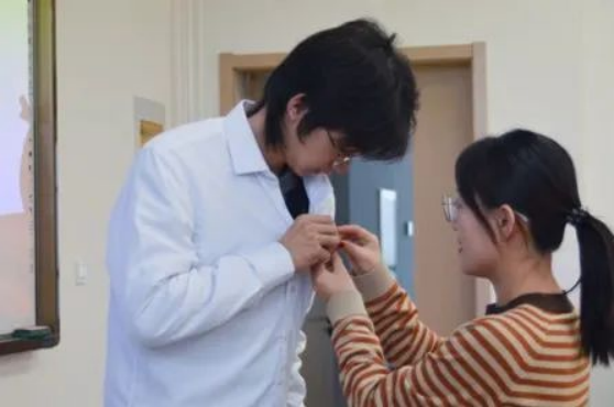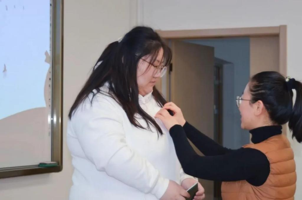 院团委辅导员老师们依次为新团员佩戴团徽、颁发团员证