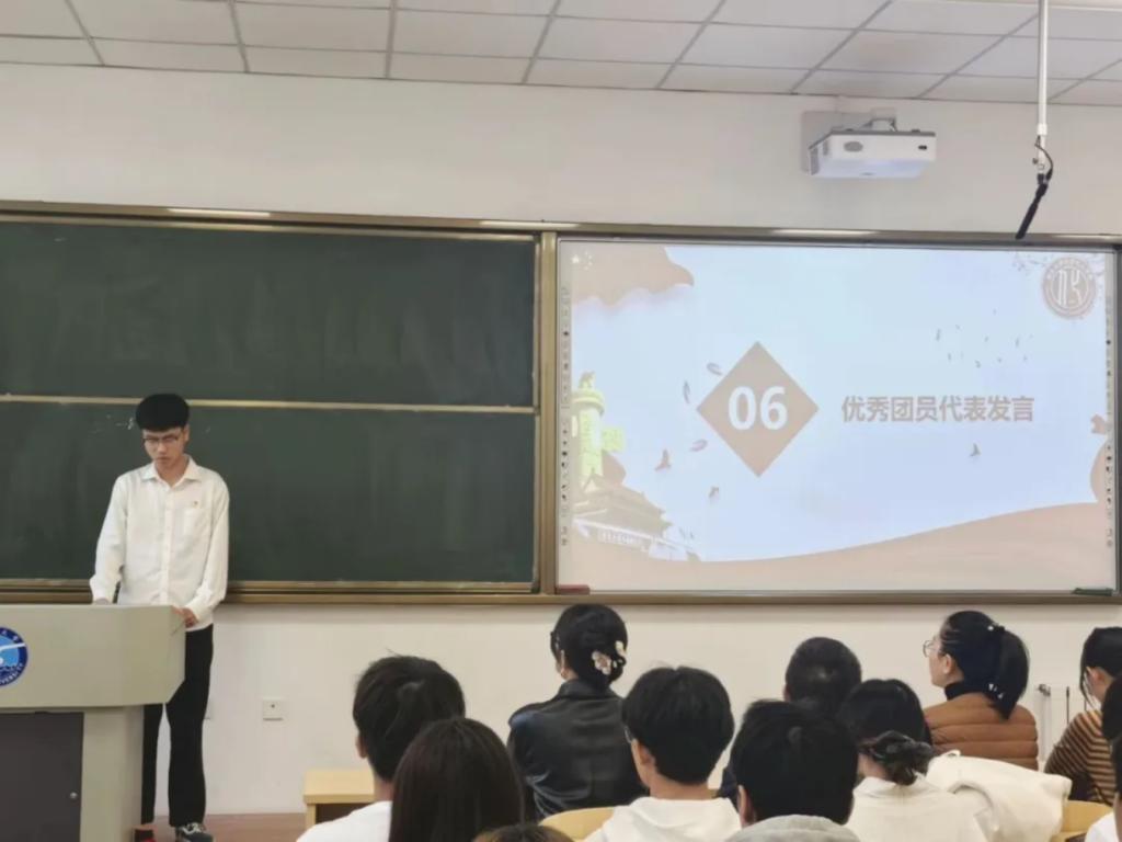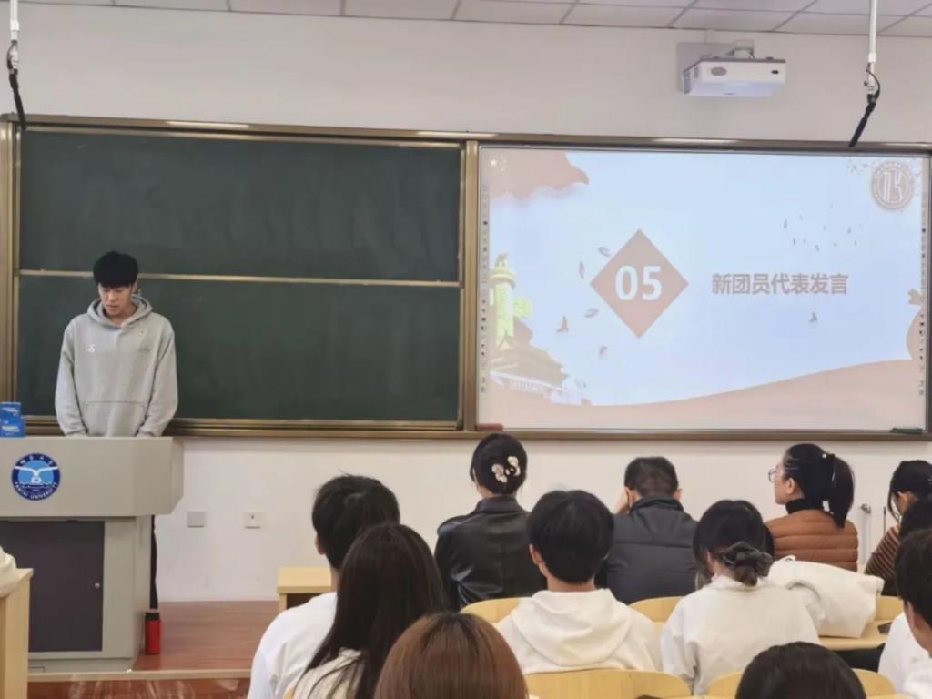 在全体新团员面向团旗进行庄严宣誓后,新团员代表马琪博表示,加入共青团是光荣的、自豪的,全体新团员将永远铭记自己立下的誓言,继承发扬共青团的优良传统,以团员的标准严格要求今后的生活、学习和工作,用实际行动践行吃苦耐劳、勤勤恳恳、用心进取的美德,争做无愧于祖国,无愧于时代的共青团员。优秀团员代表王佳浩从自身经历和感悟出发,号召新老共青团员珍惜韶华、奋发有为,用实际行动来证明自己无愧于“共青团员”这个光荣称号。