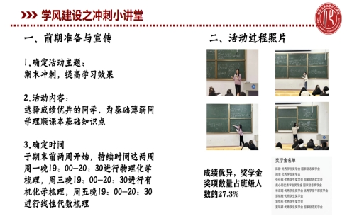 化222-2班是一个由44人组成的朝气蓬勃、刻苦学习且团结友爱的班集体。班中共有35名团员,其中入党积极分子8人,预备党员1人,班级所有同学全部进入实验室,其中有8名同学参加了今年的大学生创新创业训练计划。在导师和全体成员的共同努力下,化222-2班取得了十分出色的成绩,曾获先进班集体、“优秀志愿服务团支部”等多项荣誉。