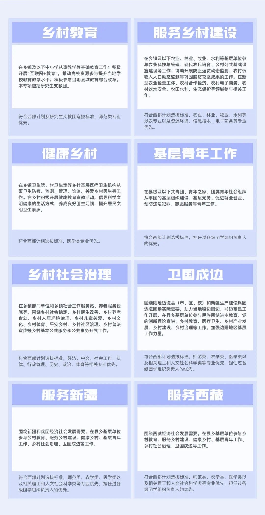 西部计划设乡村教育、服务乡村建设、健康乡村、基层青年工作、乡村社会治理、卫国戍边、服务新疆、服务西藏等8个专项,90%以上服务岗位设置在乡镇及以下。西部计划志愿者服务期为1至3年,服务协议一年一签。为激励志愿者服务期满继续扎根基层,国家在升学、就业、培训培养等多个方面给予政策支持。