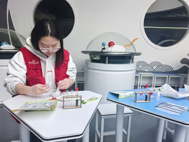 ,与同学们热情交流课程内容,并帮助他们整理零件用具。杨玉玲用热情与行动点燃了孩子们对科学的向往,让科学的火种照亮更多人的梦想之路!
