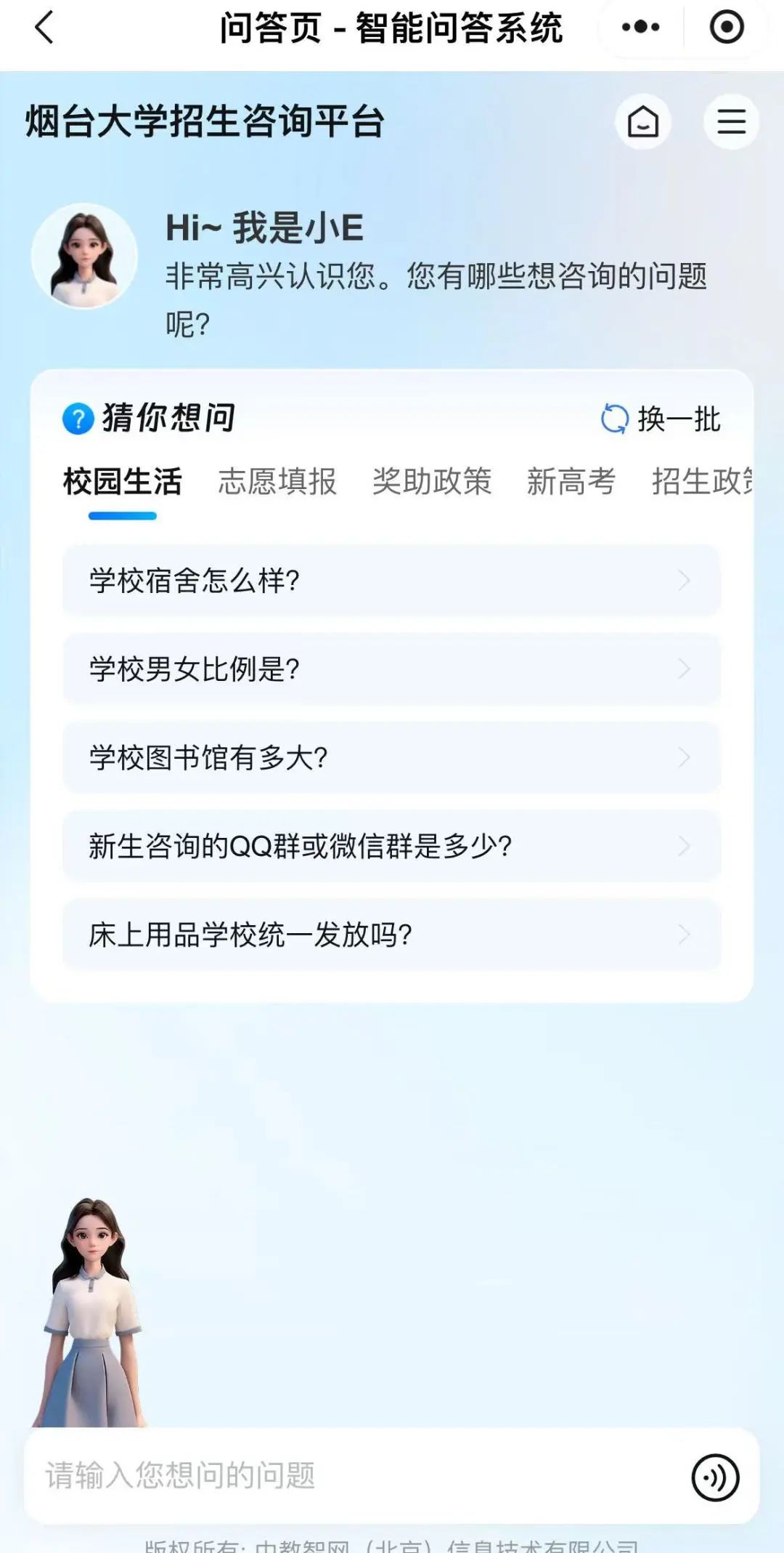 智能问答通道已开启!关于专业特色、报考政策、校园生活、未来发展...你的疑问,即刻解答。权威信息,秒速直达;个性咨询,触手可及。让精准答案如海浪奔涌,为你的梦想导航!