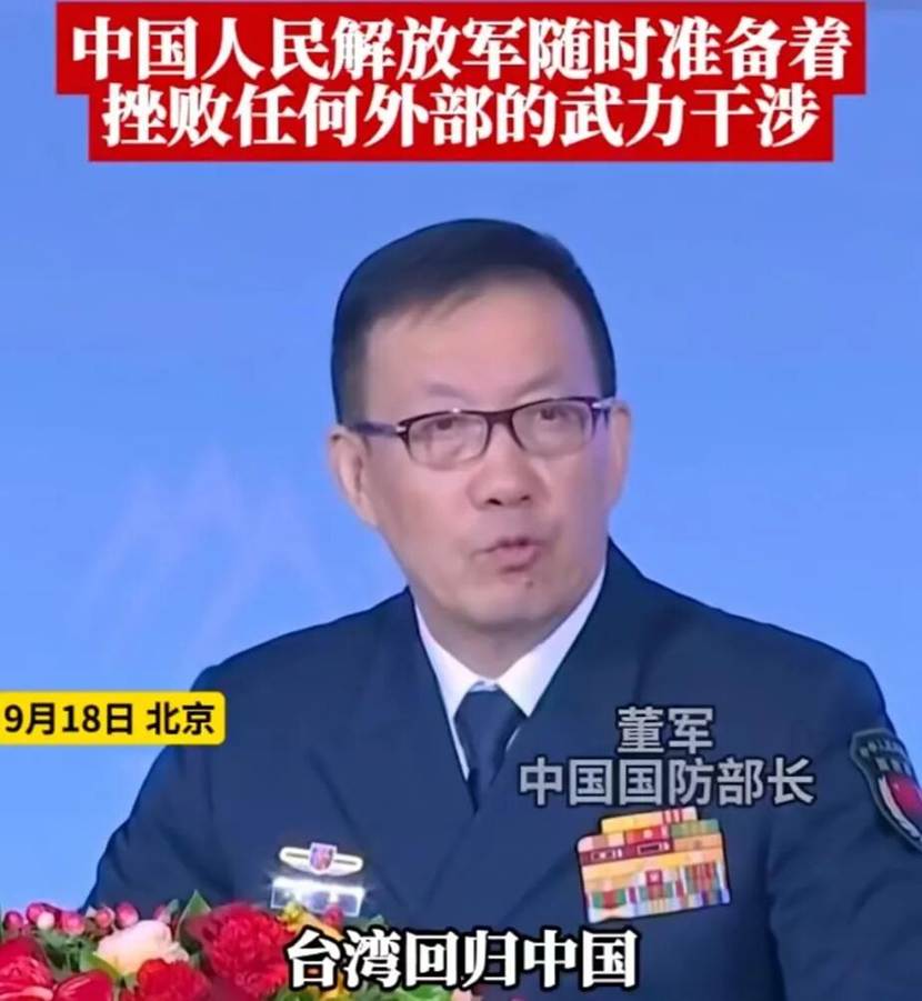 9月18日,第十二届北京香山论坛在北京国际会议中心开幕,国防部长董军出席开幕式并作主旨发言。谈到台湾问题时,董军表示,台湾回归中国,是战后国际秩序的重要组成部分,台湾属于中国的历史和法理事实不容置疑。中国人民解放军始终是捍卫祖国统一的无坚不摧的强大力量,绝不允许任何“台独”分裂图谋得逞,我们随时准备挫败任何外部武力干涉。他还表示,中国军队越强大,制约战争的力量就会越壮大,世界和平与发展就会越有保障,中国愿同爱好和平的力量一道,捍卫二战胜利成果和战后国际秩序。此外,董军提到九一八事变纪念日,我们要顺应历史大势,把握历史规律,坚定正确前进方向,回答好“和平共处”“和合共生”的时代课题,让矛盾纠葛回归生息与共,让反全球化逆流融入“同球共济”主流。
