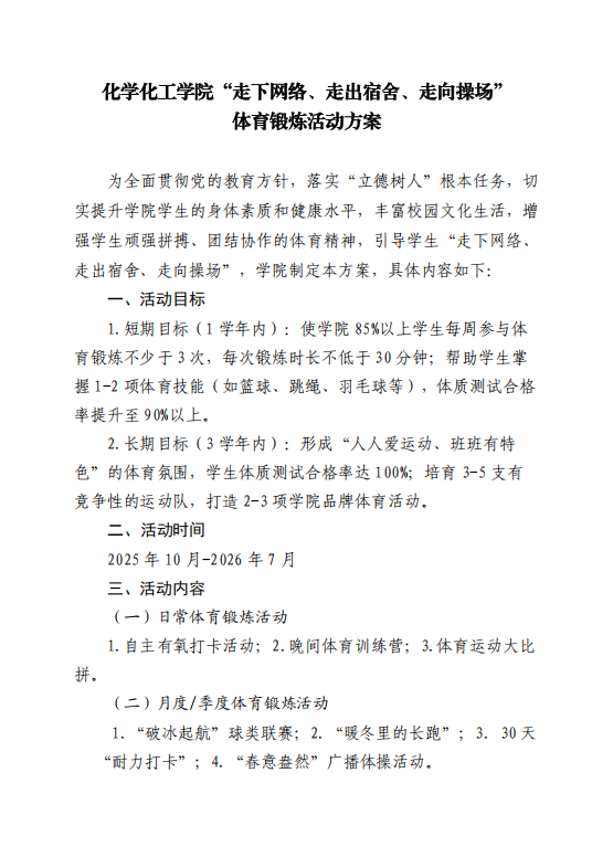 “走下网络、走出宿舍、走向操场”体育锻炼活动方案》。
