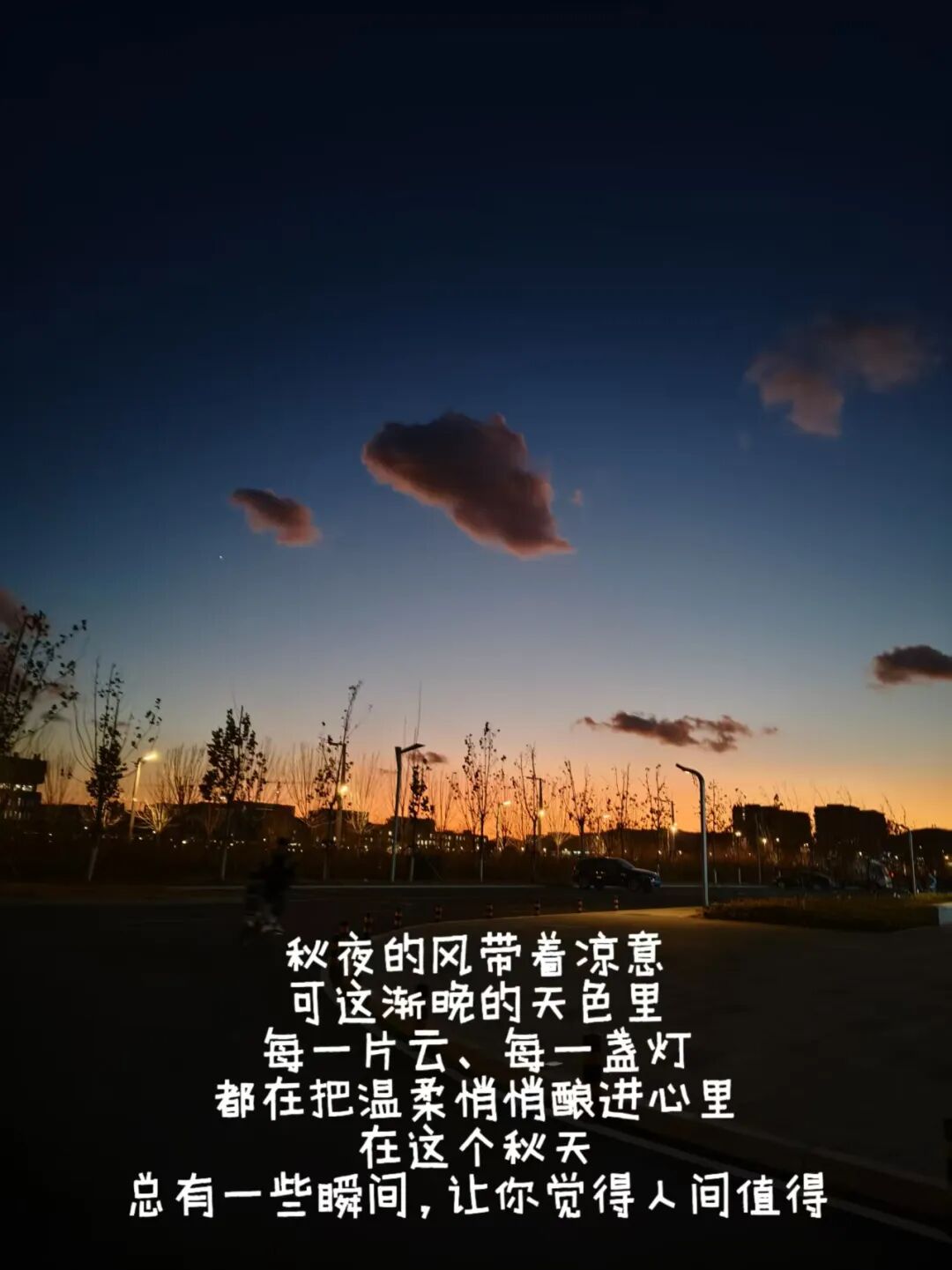 这幅图宛如一首温柔的秋夜诗篇,将城市的宁静与秋夜的浪漫完美融合。天空从深邃的蓝渐变为温暖的橙黄,仿佛是大自然在夜幕降临时的温柔调色,云朵轻轻点缀其间,像是天空中飘动的轻纱。树木、路灯和建筑在这样的背景下化作剪影,它们静静地伫立着,仿佛在诉说着城市的过往与宁静。这幅图不仅展现了秋夜的美丽,更传递出一种静谧而温暖的氛围,让人的心灵在这样的画面中得到片刻的安宁。
