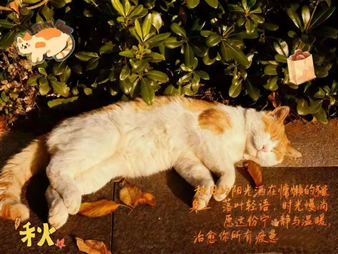 一只橘白相间的猫咪慵懒地躺在秋日的阳光下,享受着温暖的阳光,仿佛整个世界都在这一刻静止。它那柔软的毛发在阳光的照耀下显得格外蓬松,让人忍不住想要去抚摸它。周围散落着几片金黄的落叶,为画面增添了一份秋日的浪漫与温馨。这幅图不仅展现了秋日的宁静与美好,更传递出一种温暖而治愈的氛围,仿佛在告诉我们,即使在忙碌的生活中,也要记得停下脚步,享受那些简单而美好的瞬间。