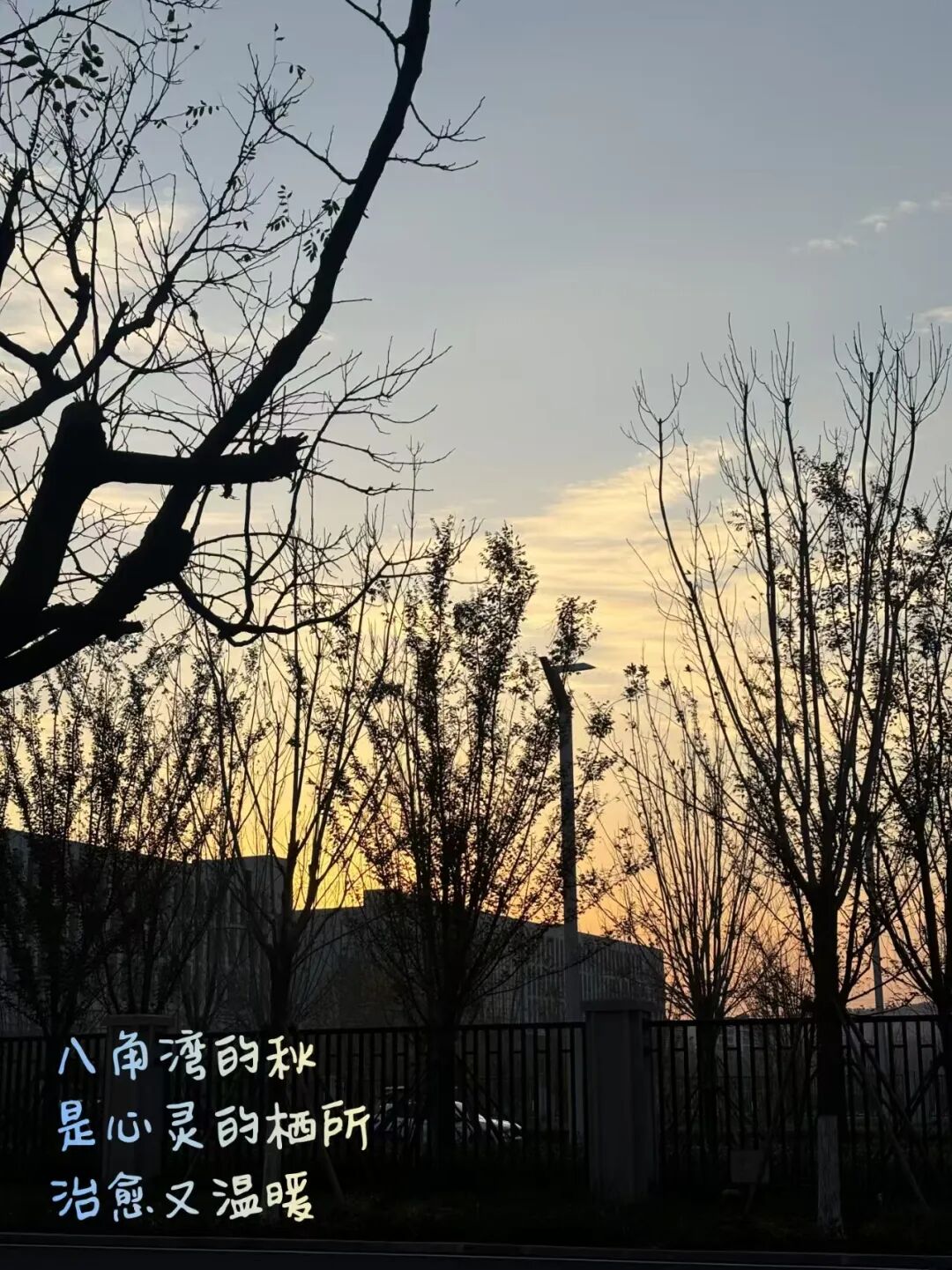 在八角湾的秋日黄昏,大自然用最温柔的笔触绘就了一幅宁静而治愈的画面。树木与建筑在夕阳的余晖中化作剪影,像是大自然精心雕琢的轮廓,静静诉说着岁月的静好。天空被染成暖黄的渐变色,从浅浅的金色到深深的橙黄,仿佛是大自然调制的温暖颜料,将整个世界都包裹在一片柔和的光辉之中。