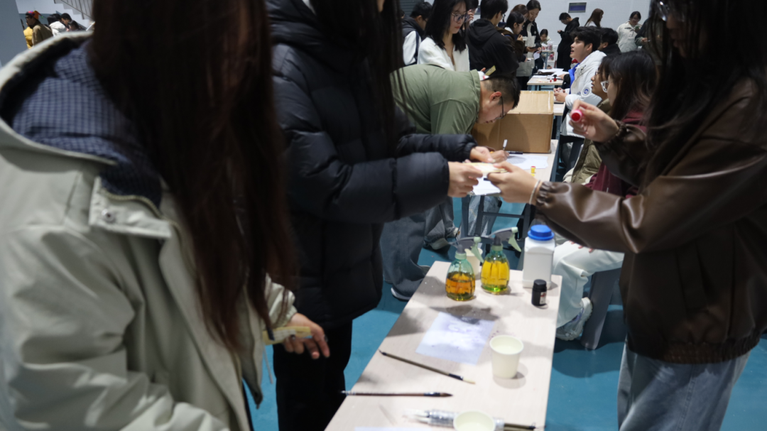 喷雾作画的摊位前更是挤满了人,随着不同试剂在纸上轻轻喷洒,原本空白的画纸渐渐晕开蓝的深邃、紫的浪漫、粉的温柔,宛如“科学魔法”在指尖绽放;