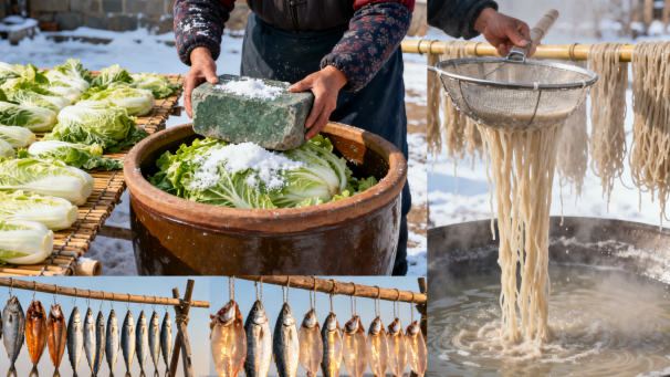 北方人家会腌酸菜,白菜洗净晾干,入缸撒盐,压上重物,数周后开缸,酸香扑鼻,脆爽开胃。