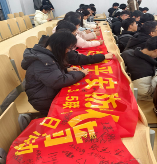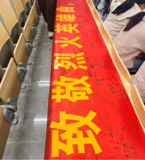 活动的尾声庄重而感人。在宣誓环节后,印有“致敬烈火英雄曲,共筑平安防火墙”字样的红色横幅徐徐展开。同学们依次有序而郑重地签下自己的名字。