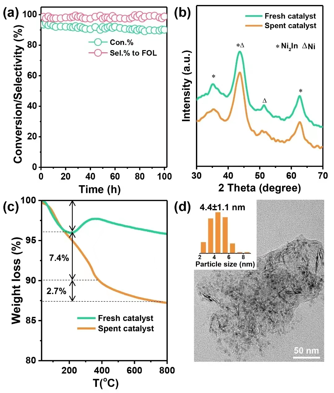 Figure 8.(a) Durability test for FAL hydrogenation over NiIn0.2/MgO-Al2O3. (b) XRD patterns, (c) TG curves and (d) TEM images of fresh and spent NiIn0.2/MgO-Al2O3. Reaction conditions: under 100oC, 2 MPa, substrate/Ni=12, contract time 2 h, and H2/substrate=300.