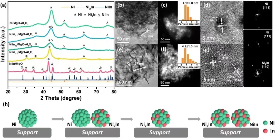 Figure 2.(a) XRD patterns of Ni and Ni-In catalysts. TEM, STEM, and HRTEM images of (b, c, d) Ni/MgO-Al2O3and (e, f, g) NiIn0.2/MgO-Al2O3. The inset images correspond to the particle size distribution and the Ni and Ni2In-associated fast Fourier transformation, respectively. (h) Proposed phase transformation process of Ni-In IMCs.