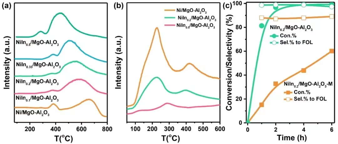 Figure 5.(a) H2-TPR profilesand (b) H2-TPD profiles of Ni and Ni-In IMCs samples. (c) FAL hydrogenation over NiIn0.2/MgO-Al2O3and NiIn0.2/MgO-Al2O3-M catalysts. Reaction condition: 100oC, 2 MPa H2, and substrate/Ni=12.