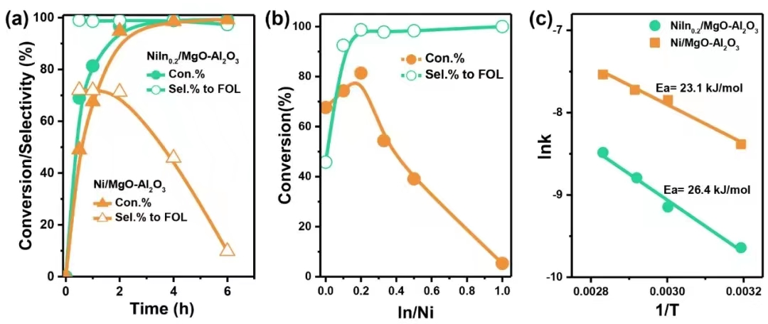 Figure 4.(a) Catalytic FAL hydrogenation performances over NiIn0.2/MgO-Al2O3and Ni/MgO-Al2O3. (b)FAL conversion and corresponding selectivity to FOL over Ni-based catalysts with different in content under 100oC, 2 MPa, 1 h, and substrate/Ni=12. (c) Plot of lnkas a function of 1/T over NiIn0.2/MgO-Al2O3and Ni/MgO-Al2O3, derived from FAL reaction rates vs reaction time.