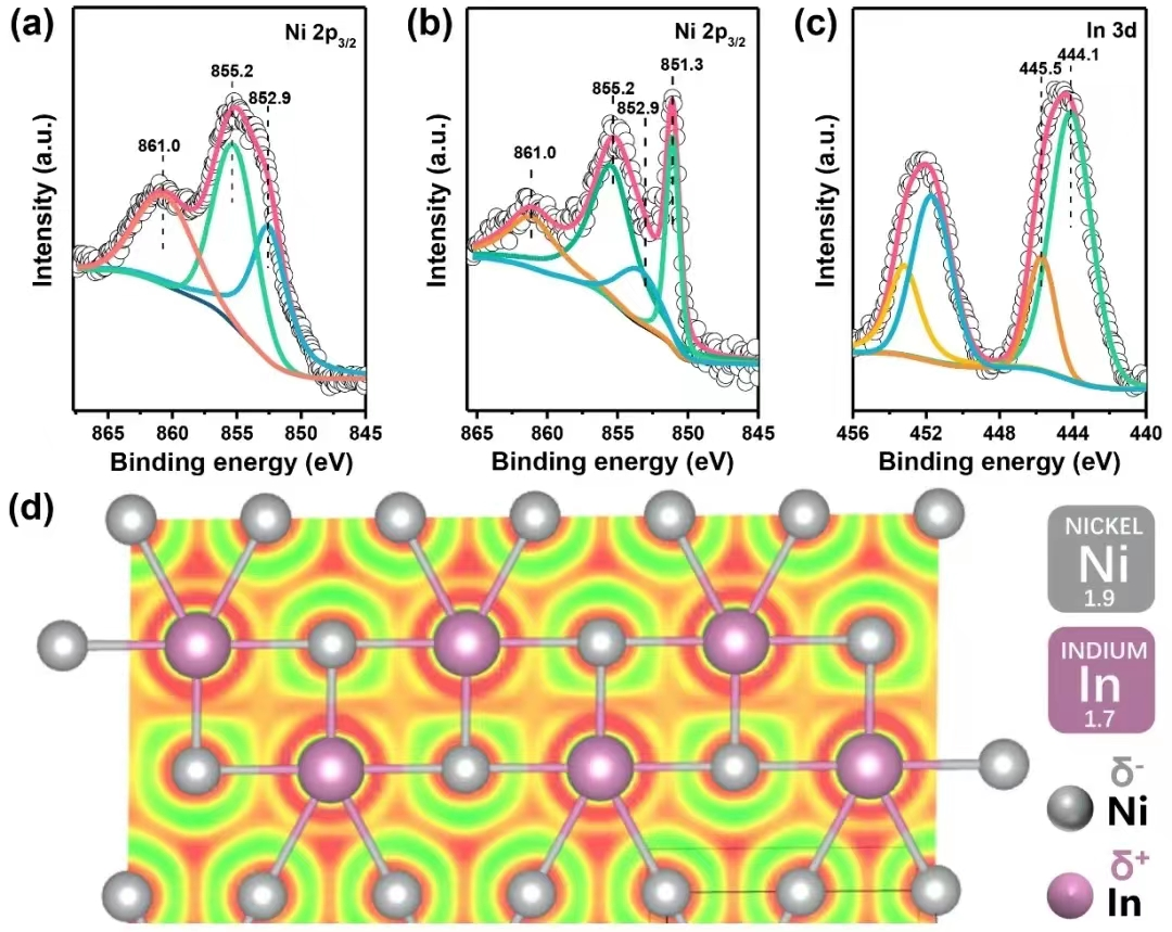 Figure 3.XPS of the Ni 2p3/2in (a) Ni/MgO-Al2O3and (b) NiIn0.2/MgO-Al2O3. (c) XPS of the In 3d region in NiIn0.2/MgO-Al2O3. (d) The calculated electron localization function map of the Ni2In intermetallic compound.
