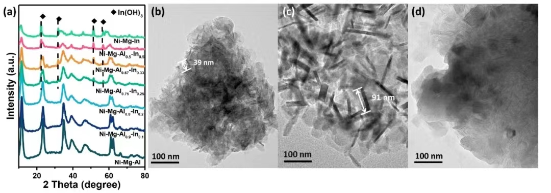 Figure 1.(a) XRD patterns of Ni and Ni-In LDHs. TEM images of (b) Ni-Mg-Al, (c) Ni-Mg-Al0.8-In0.2, and (d) Ni-Mg-In.