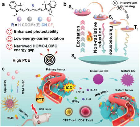 转移瘤的发生是临床癌症治疗失败和患者死亡的主要原因。光热免疫治疗是一种非侵袭性、易诱导免疫原性的高效癌症治疗策略。因此,通过结构修饰改性增强染料分子的非辐射能量跃迁以提高光热转换效率成为研究重点。