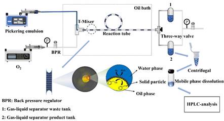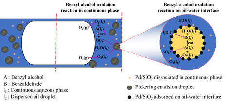 赵玉潮教授课题组借助Pickering乳液开展了微反应器内苯甲醇气-液-固多相催化氧化实验研究,有效避免了固体催化剂颗粒在流动过程中与壁面直接接触所导致的黏附及堵塞等问题,且该体系具有良好的稳定性。通过操作条件的优化,苯甲醇的转化率可达86.53%,苯甲醛的选择性高达99.79%,并分析了Taylor流型下Pickering乳液体系的界面传质-反应机理。