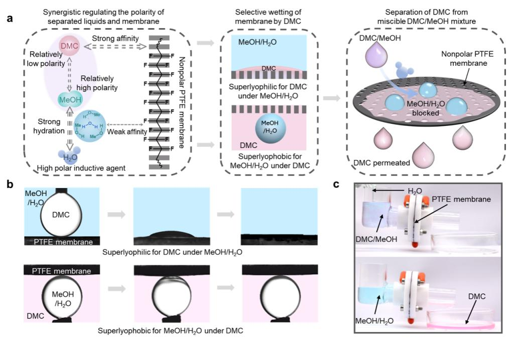 刘洪亮教授团队设计开发了一种超浸润膜分离系统,实现了DMC和MeOH的低能耗、高效分离,分离通量高达1090 L m-2h-1,比传统的膜分离技术高2-3个数量级。该超浸润膜分离系统以多孔聚四氟乙烯(PTFE)作为超浸润膜,环保的水分子(H2O)作为液体诱导剂,协同利用非极性的PTFE多孔膜和较低极性DMC之间的非极性作用以及高极性H2O和较高极性MeOH之间的强氢键作用,使DMC快速、选择性地透过PTFE膜。得益于超浸润膜易集成的特点,团队设计了基于超浸润分离膜和渗透汽化膜的膜分离组件,DMC的纯度大于99.4 wt%,在DMC的实际生产中展现了巨大潜力。