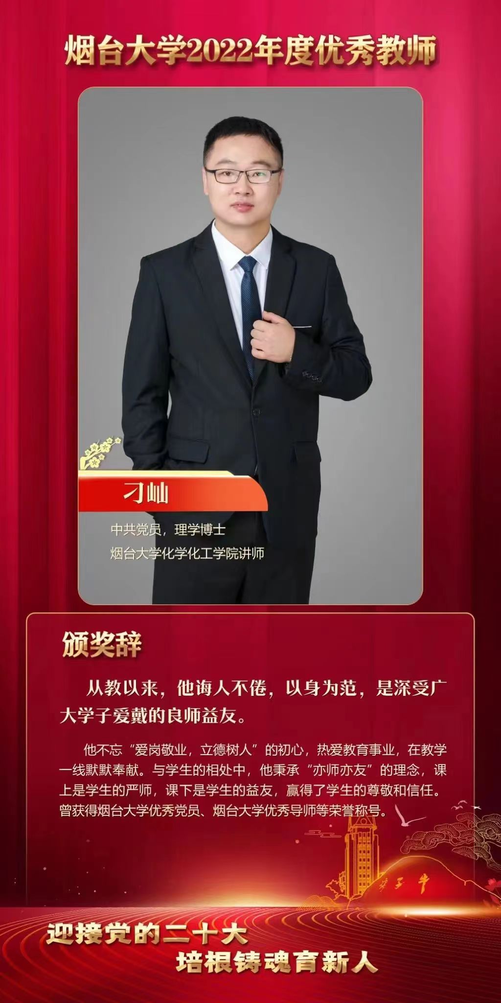 2022年度优秀教师荣誉称号,侯建海老师获评烟台大学2022年度优秀教育工作者荣誉称号。一起来认识一下他们吧!