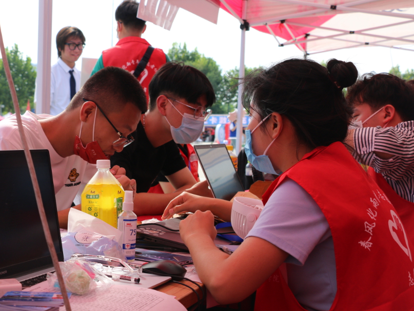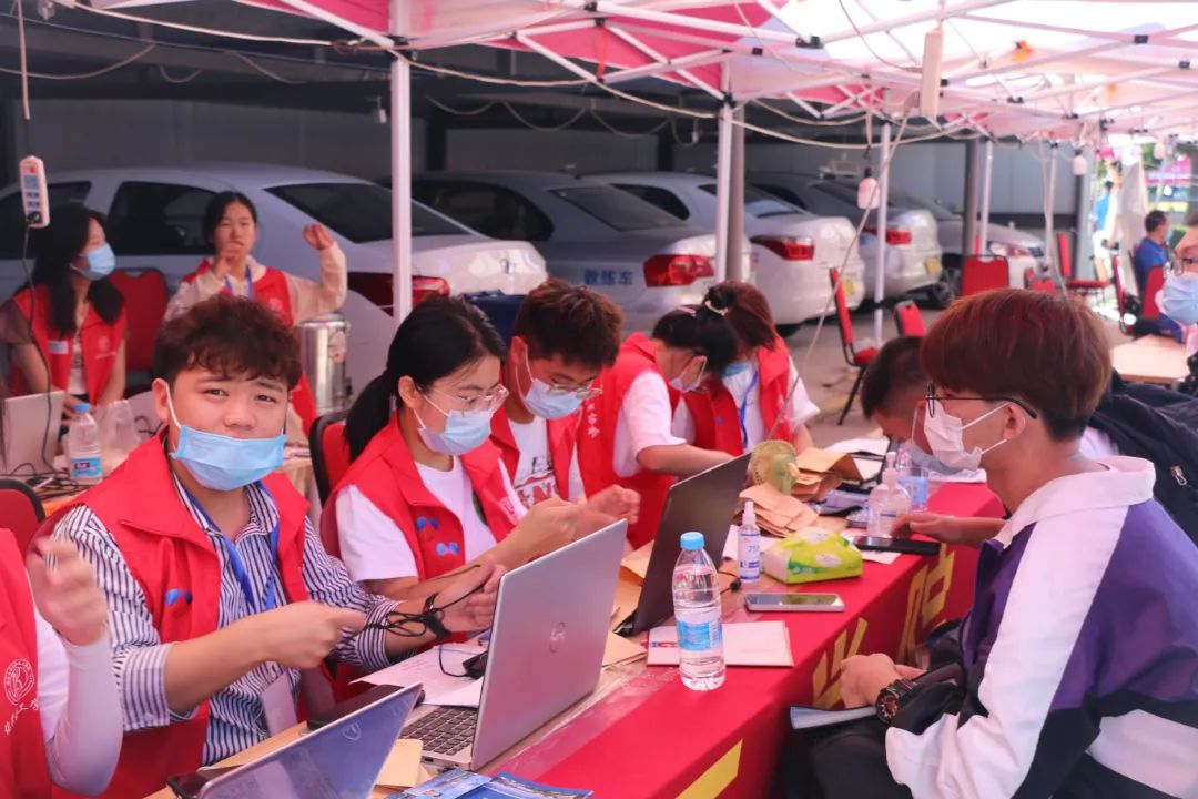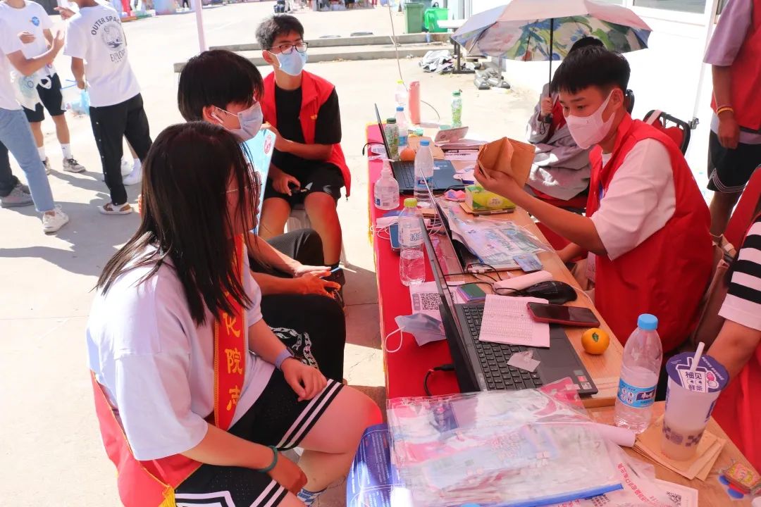 的登记处,领取校园卡、宿舍钥匙。大导助、小导助、新生志愿者们,帮助新生到宿舍安顿,并为他们解疑答惑。汗珠滴落,手掌勒红,但他们仍保持对新生的热情。