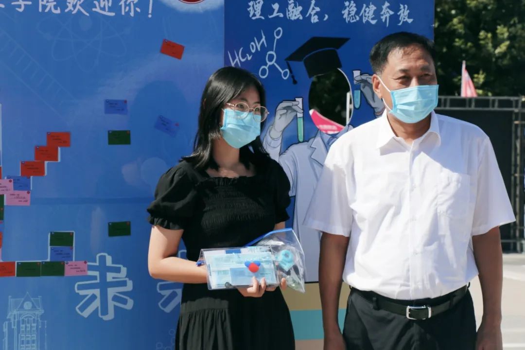 更是别出心裁地准备了锦囊礼包和“化身实验员”留影活动,新同学怀着雀跃的心情打开礼包,原来是我“化小水”呀,另外还有各式各样的心愿贴和防疫物资。