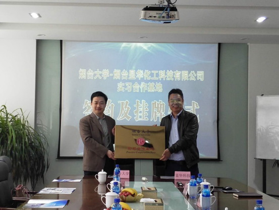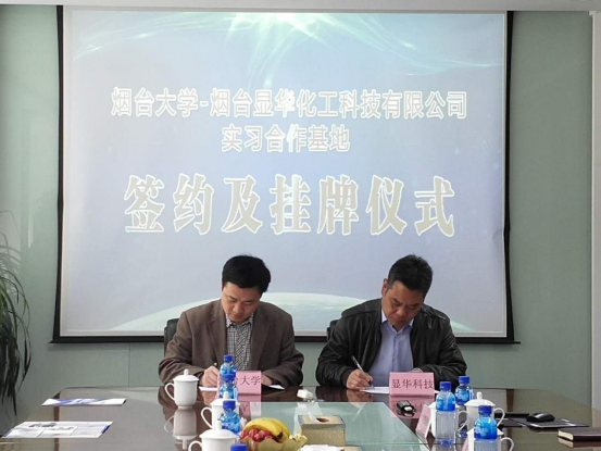 实习基地协议签订及挂牌仪式在烟台显华化工科技有限公司总部进行,副院长李文佐代表绿帽社