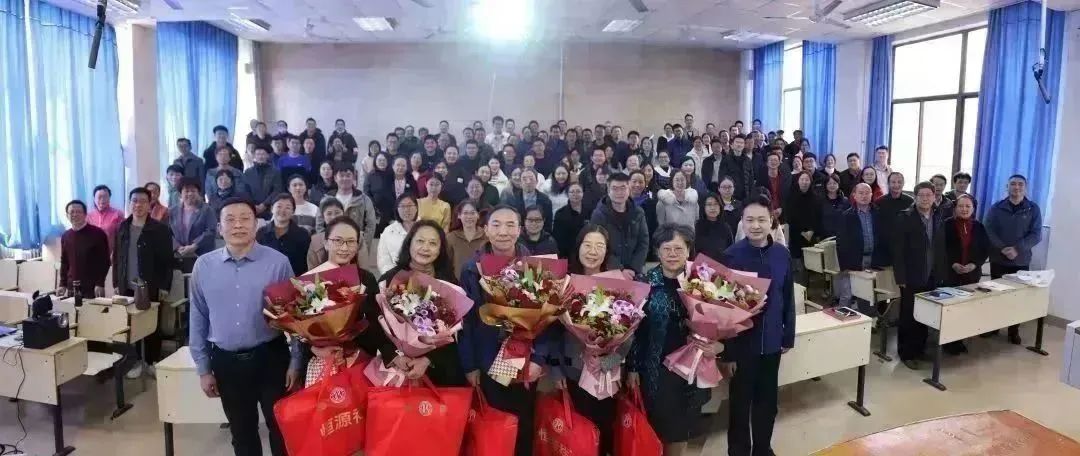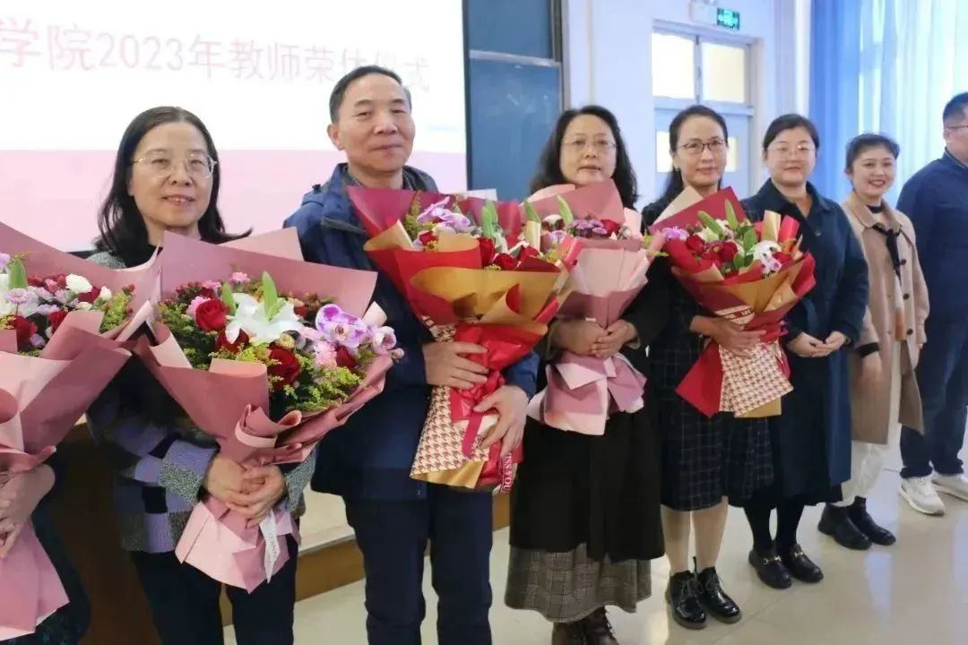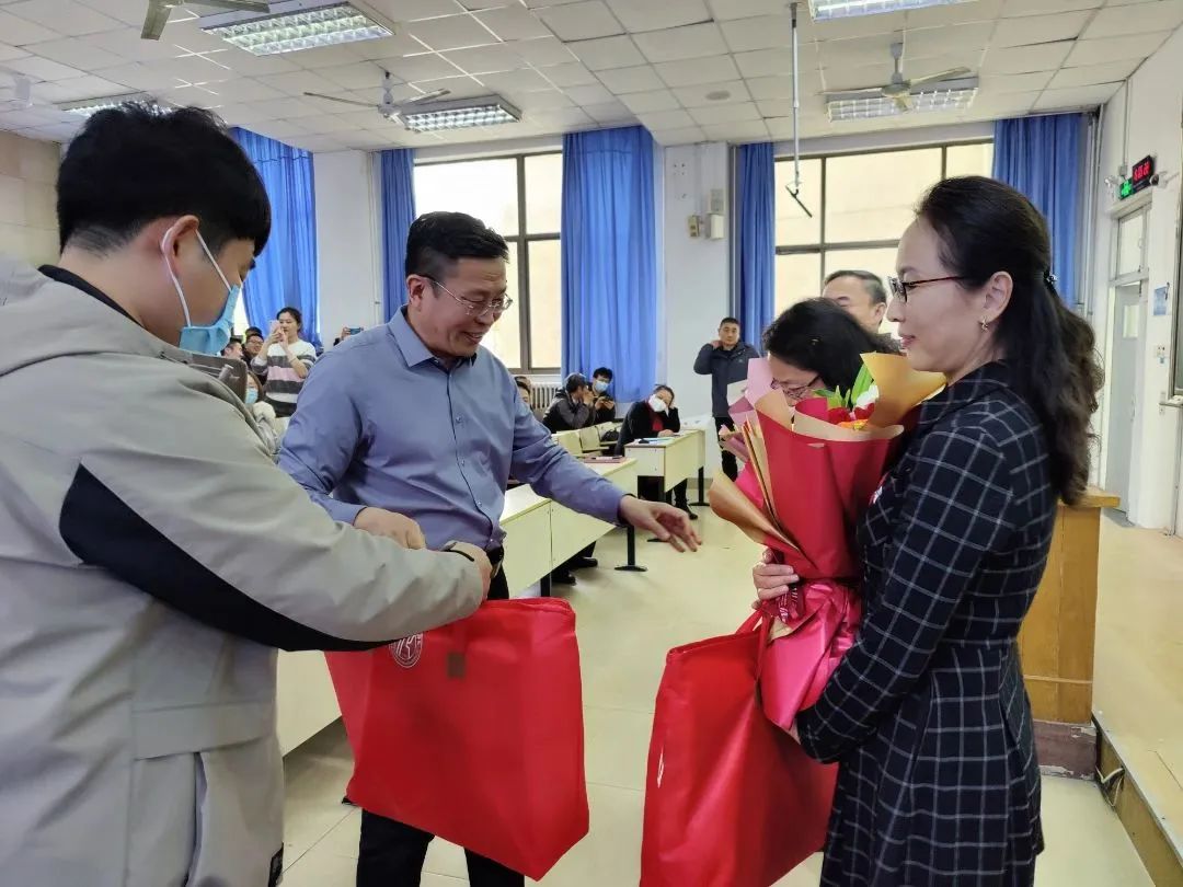 党委书记段志国带领年轻教师,为荣休教师献花并赠送纪念品;院长李文佐代表绿帽社