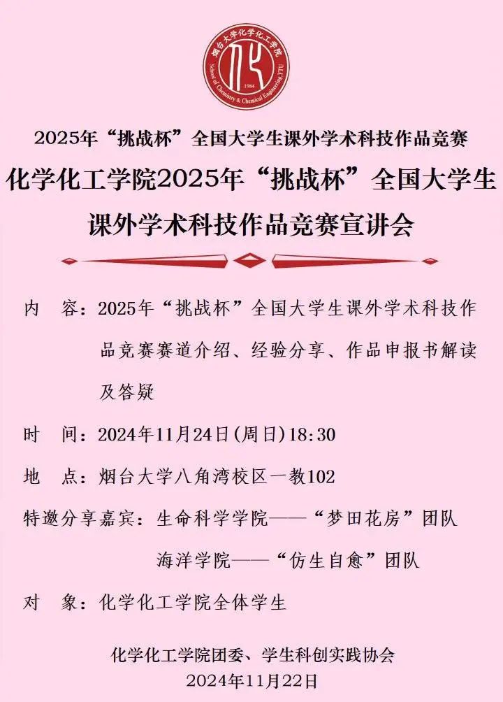 2025年“挑战杯”大学生课外学术科技作品竞赛宣讲会,现将有关事宜通知如下: