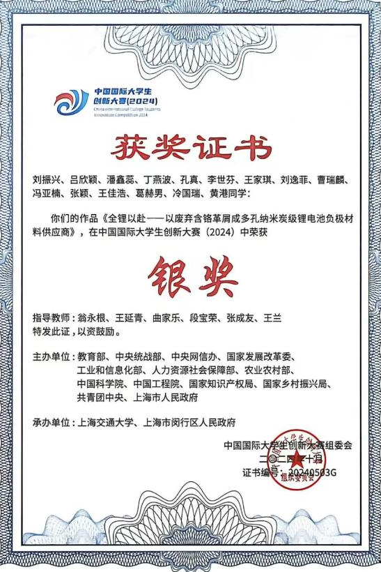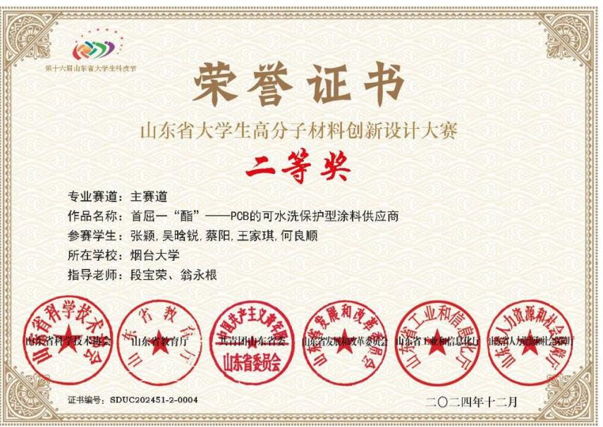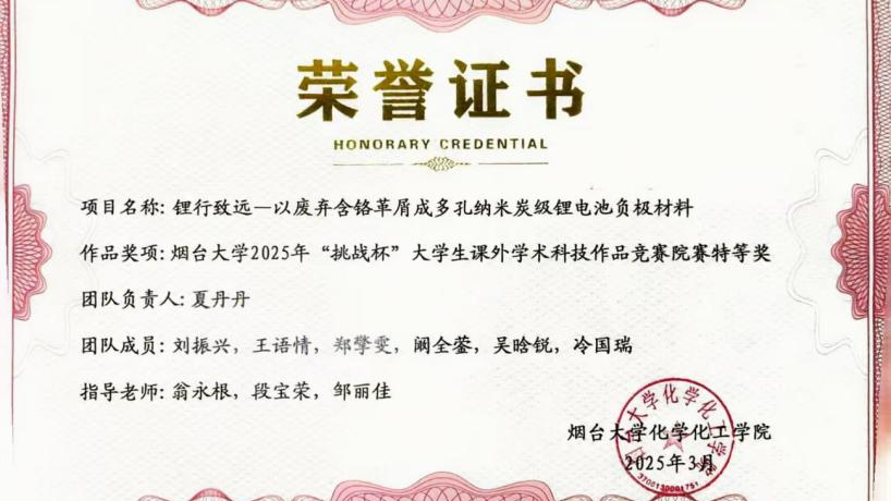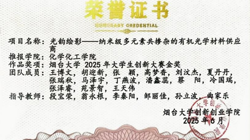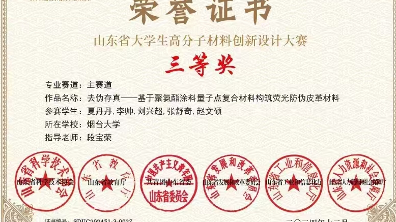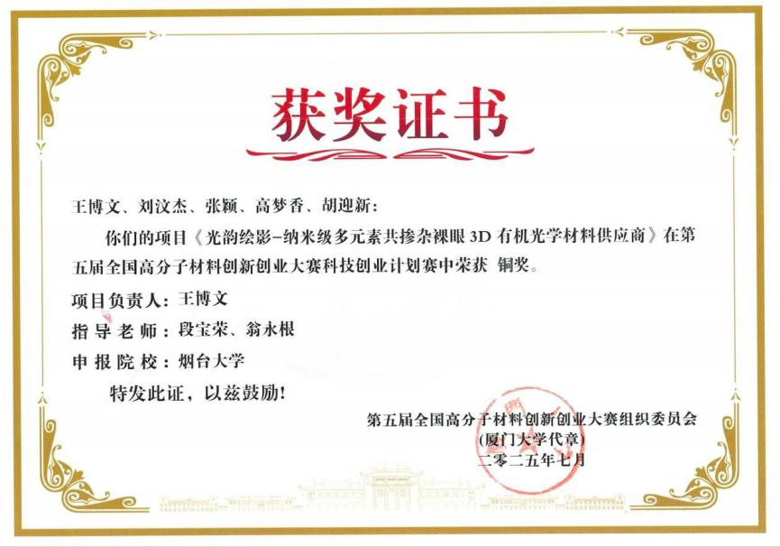 曾获得山东省大学生高分子材料创新设计大赛二等奖、中国国际大学生创新大赛银奖、建行杯”山东省大学生创新大赛铜奖、第五届全国高分子材料创新创业大赛铜奖等奖项。